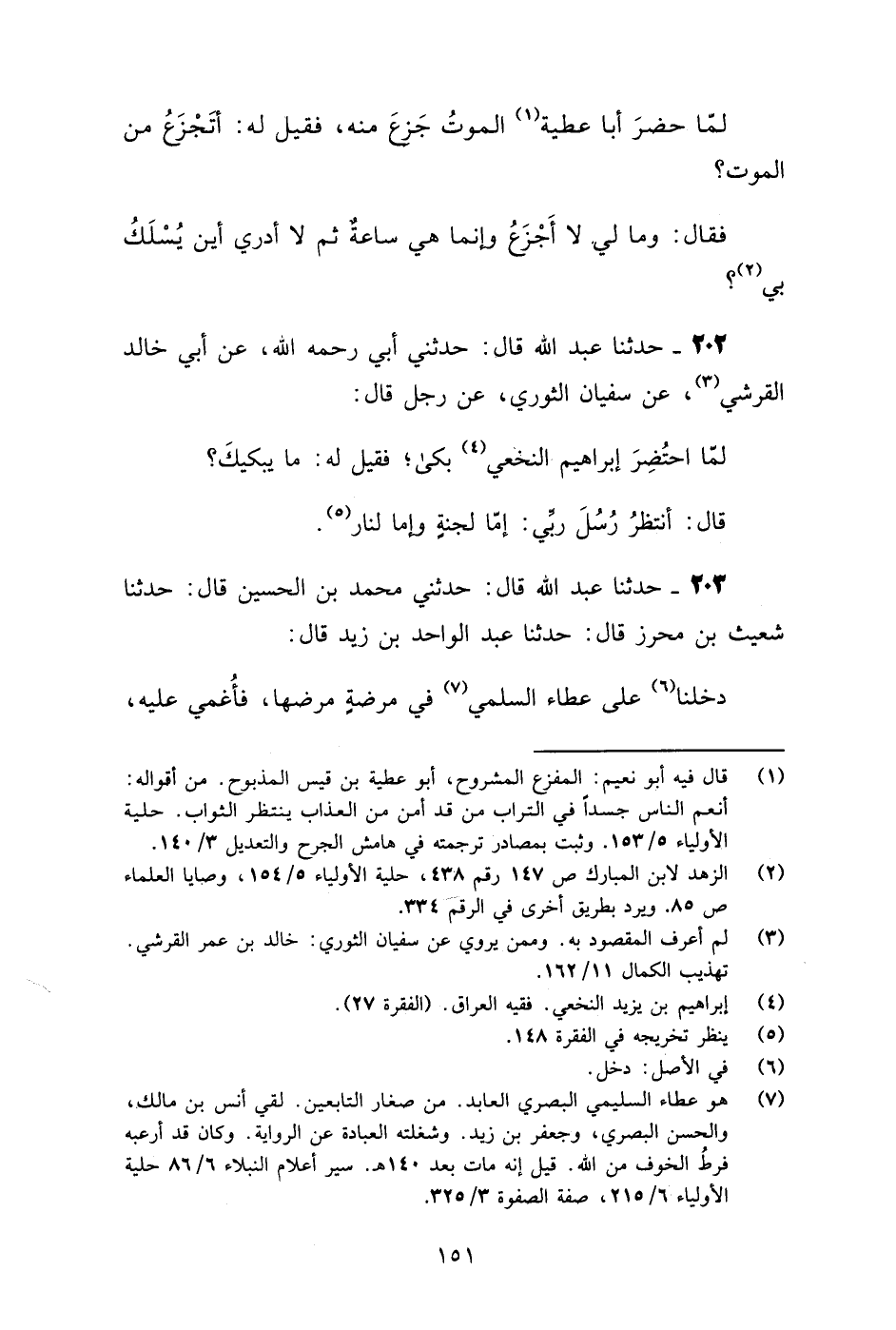 203 - حَدَّثَنَا عَبْدُ اللَّهِ قَالَ: حَدَّثَنِي مُحَمَّدُ بْنُ الْحُسَيْنِ قَالَ: حَدَّثَنَا شُعَيْبُ بْنُ مُحْرِزٍ قَالَ: حَدَّثَنَا عَبْدُ الْوَاحِدِ بْنُ زَيْدٍ قَالَ: دَخَلْنَا عَلَى عَطَاءٍ السُّلَمِيِّ فِي مَرْضَةٍ مَرِضَهَا، فَأُغْمِيَ عَلَيْهِ -[152]-، فَأَفَاقَ، فَرَفَعَ أَصْحَابُهُ أَيْدِيهِمْ يَدْعُونَ لَهُ، فَنَظَرَ إِلَيْهِمْ ثُمَّ قَالَ: " يَا أَبَا عُبَيْدَةَ، §مُرْهُمْ فَلْيُمْسِكُوا عَنِّي، فَوَاللَّهِ لَوَدِدْتُ أَنَّ رُوحِي تَرَدَّدُ بَيْنَ لَهَاتِي وَحَنْجَرَتِي إِلَى يَوْمِ الْقِيَامَةِ مَخَافَةَ أَنْ تَخْرُجَ إِلَى النَّارِ، قَالَ: ثُمَّ بَكَى قَالَ عَبْدُ الْوَاحِدِ: فَأَبْكَانِي - وَاللَّهِ - فَرَقًا مِمَّا يَهْجُمُ عَلَيْهِ بَعْدَ الْمَوْتِ