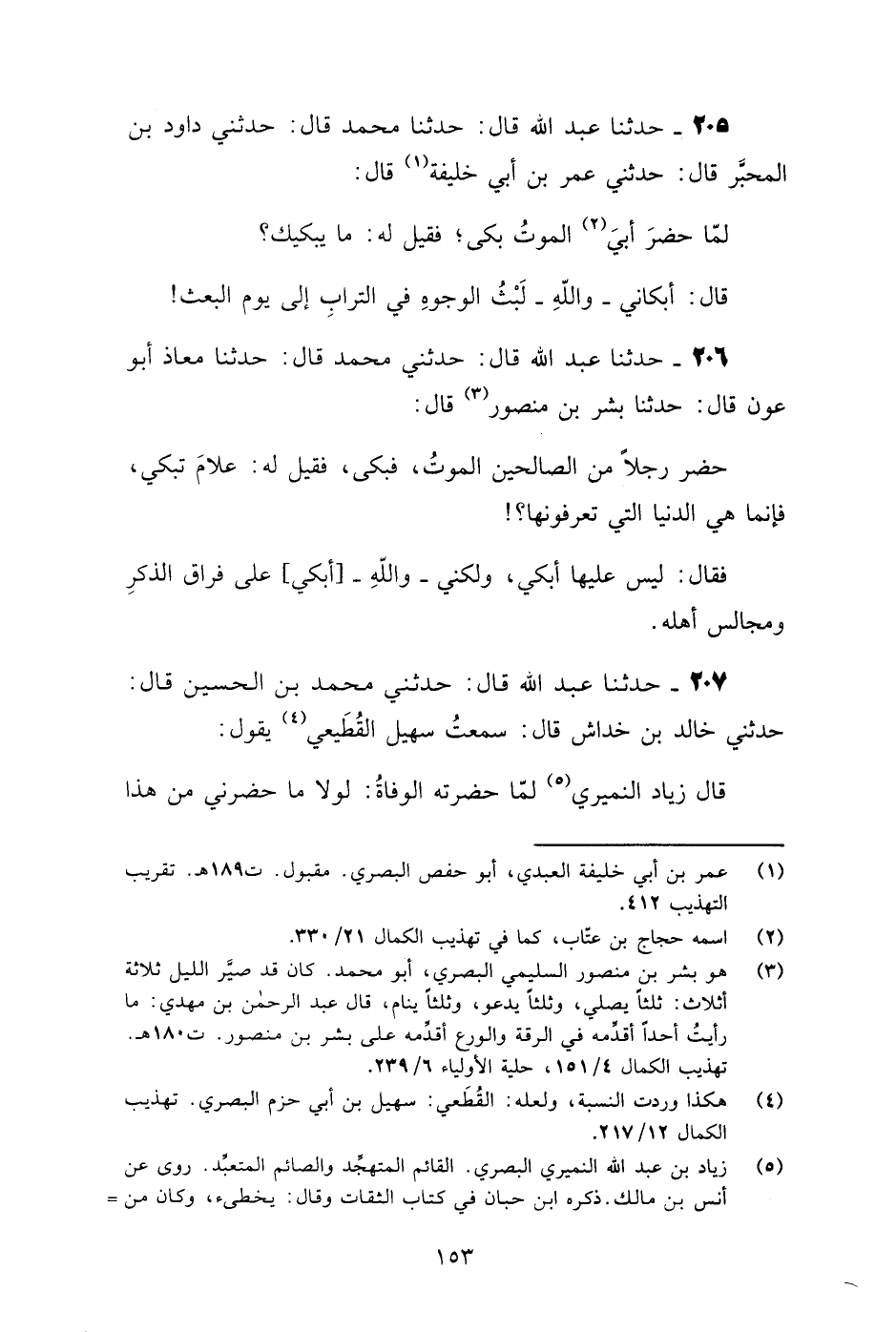 206 - حَدَّثَنَا عَبْدُ اللَّهِ قَالَ: حَدَّثَنِي مُحَمَّدٌ قَالَ: حَدَّثَنَا مُعَاذُ أَبُو عَوْنٍ قَالَ: حَدَّثَنَا بِشْرُ بْنُ مَنْصُورٍ قَالَ: " §حَضَرَ رَجُلًا مِنَ الصَّالِحِينَ الْمَوْتُ، فَبَكَى، فَقِيلَ لَهُ: عَلَامَ تَبْكِي، فَإِنَّمَا هِيَ الدُّنْيَا الَّتِي تَعْرِفُونَهَا؟ فَقَالَ: لَيْسَ عَلَيْهَا أَبْكِي، وَلَكِنِّي - وَاللَّهِ - أَبْكِي عَلَى فِرَاقِ الذِّكْرِ وَمَجَالِسِ أَهْلِهِ "