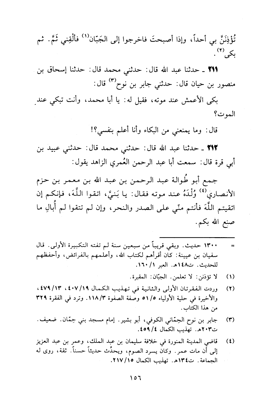 211 - حَدَّثَنَا عَبْدُ اللَّهِ قَالَ: حَدَّثَنِي مُحَمَّدٌ قَالَ: حَدَّثَنَا إِسْحَاقُ بْنُ مَنْصُورِ بْنِ حَيَّانَ قَالَ: حَدَّثَنِي جَابِرُ بْنُ نُوحٍ قَالَ: بَكَى الْأَعْمَشُ عِنْدَ مَوْتِهِ، فَقِيلَ لَهُ: يَا أَبَا مُحَمَّدٍ، وَأَنْتَ تَبْكِي عِنْدَ الْمَوْتِ؟ قَالَ: «§وَمَا يَمْنَعُنِي مِنَ الْبُكَاءِ وَأَنَا أَعْلَمُ بِنَفْسِي؟»
