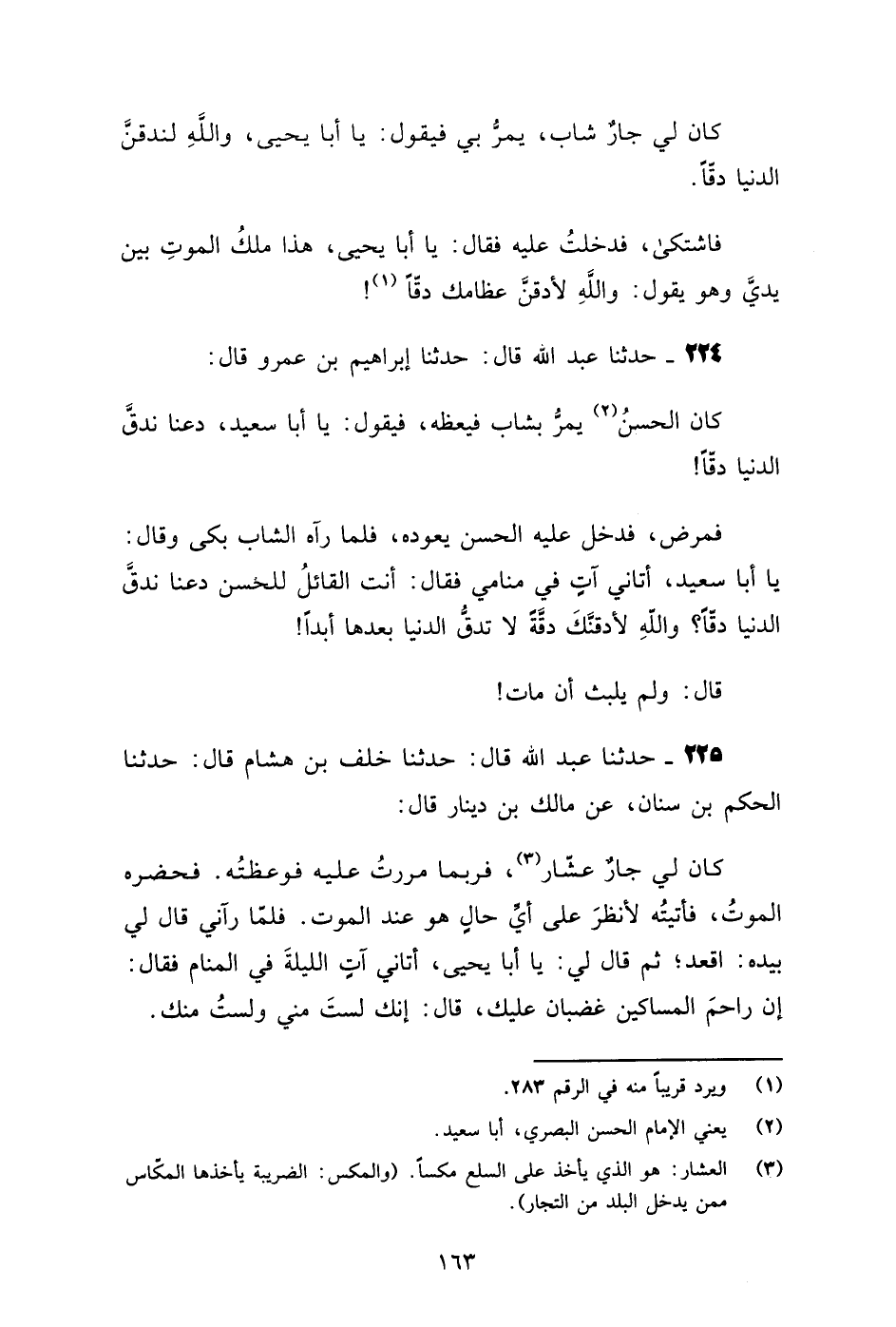 حَدَّثَنَا عَبْدُ اللَّهِ قَالَ: حَدَّثَنَا خَلَفُ بْنُ هِشَامٍ قَالَ: حَدَّثَنَا الْحَكَمُ بْنُ سِنَانٍ، عَنْ مَالِكِ بْنِ دِينَارٍ قَالَ: " §كَانَ لِي جَارٌ عَشَّارٌ، فَرُبَّمَا مَرَرْتُ عَلَيْهِ فَوَعَظْتُهُ. فَحَضَرَهُ الْمَوْتُ، فَأَتَيْتُهُ لِأَنْظُرَ عَلَى أَيِّ حَالٍ هُوَ عِنْدَ الْمَوْتِ. فَلَمَّا رَآنِي قَالَ لِي بِيَدِهِ: اقْعُدْ؛ ثُمَّ قَالَ لِي: يَا أَبَا يَحْيَى، أَتَانِي آتٍ اللَّيْلَةَ فِي الْمَنَامِ فَقَالَ: إِنَّ رَاحِمَ الْمَسَاكِينِ غَضْبَانُ عَلَيْكَ، قَالَ: إِنَّكَ لَسْتَ مِنِّي وَلَسْتُ مِنْكَ -[164]-. قَالَ مَالِكٌ: فَفَزِعْتُ، وَظَنَنْتُ أَنَّهُ يَعْنِينِي فَوَضَعَ يَدَهُ عَلَى رَأْسِهِ، ثُمَّ أَعَادَ الْقَوْلَ فَخَرَجْتُ مِنْ عِنْدِهِ، فَلَمْ أَبْلُغِ الْبَابَ حَتَّى سَمِعْتُ الصُّرَاخَ عَلَيْهِ "