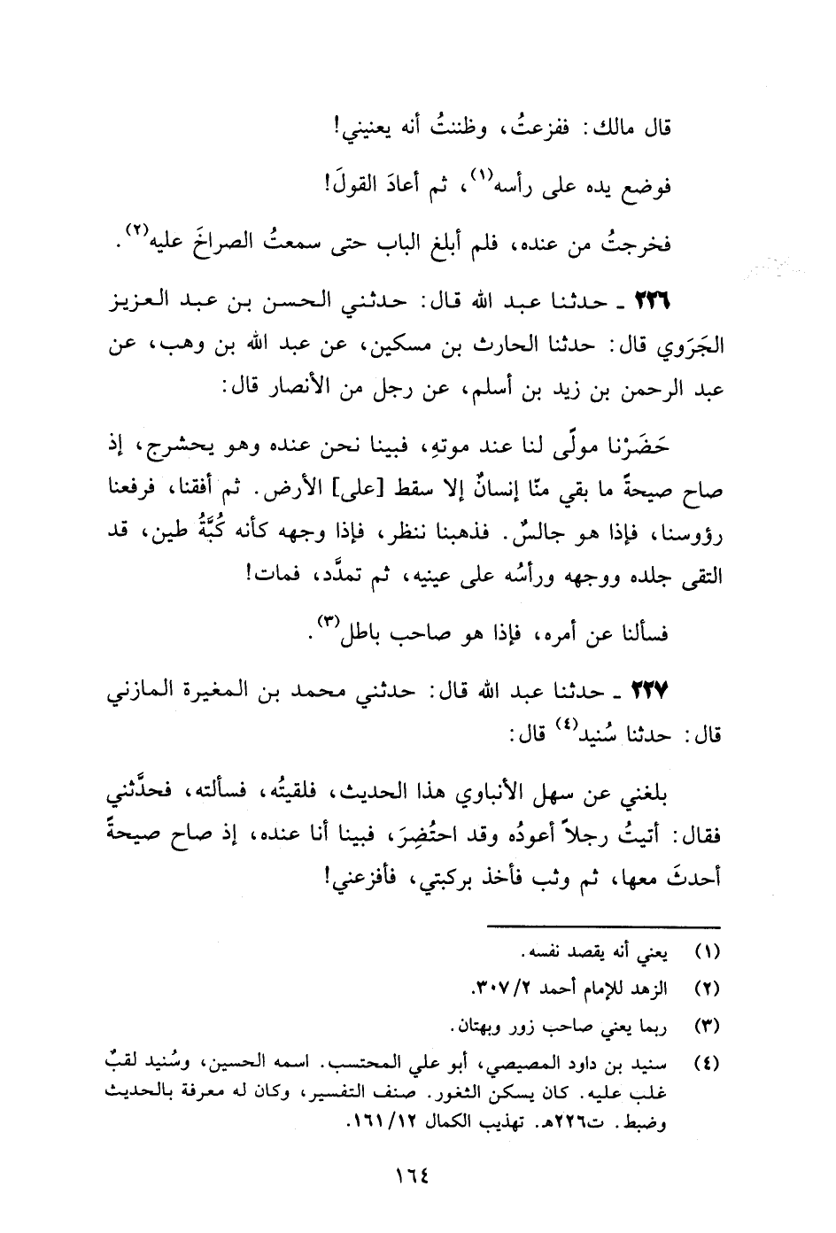 حَدَّثَنَا عَبْدُ اللَّهِ قَالَ: حَدَّثَنِي مُحَمَّدُ بْنُ الْمُغِيرَةِ الْمَازِنِيُّ قَالَ: حَدَّثَنَا سُنَيْدٌ قَالَ: بَلَغَنِي عَنْ سَهْلٍ الْأَنْبَاوِيِّ هَذَا الْحَدِيثُ، فَلَقِيتُهُ، فَسَأَلْتُهُ، فَحَدَّثَنِي فَقَالَ: " §أَتَيْتُ رَجُلًا أَعُودُهُ وَقَدِ احْتُضِرَ، فَبَيْنَا أَنَا عِنْدَهُ، إِذْ صَاحَ صَيْحَةً أَحْدَثَ مَعَهَا، ثُمَّ وَثَبَ فَأَخَذَ بِرُكْبَتِي، فَأَفْزَعَنِي -[165]- قُلْتُ: مَا قِصَّتُكَ؟ قَالَ: هُوَ ذَا حَبَشِيٌّ أَزْرَقُ، عَيْنَاهُ مِثْلُ السُّكْرُكَتَيْنِ، فَغَمَزَنِي غَمْزَةً أَحْدَثْتُ مِنْهَا، فَقَالَ لِي: مَوْعِدُكَ الظُّهْرَ. فَسَأَلْتُ عَنْهُ: أَيَّ شَيْءٍ كَانَ يَعْمَلُ؟ قَالَ: كَانَ يَشْرَبُ النَّبِيذَ "