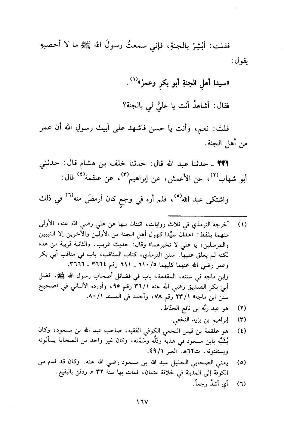 حَدَّثَنَا عَبْدُ اللَّهِ قَالَ: حَدَّثَنَا خَلَفُ بْنُ هِشَامٍ قَالَ: حَدَّثَنِي أَبُو شِهَابٍ، عَنِ الْأَعْمَشِ، عَنْ إِبْرَاهِيمَ، عَنْ عَلْقَمَةَ قَالَ: وَاشْتَكَى عَبْدُ اللَّهِ، فَلَمْ أَرَهُ فِي وَجَعٍ كَانَ أَرْمَضَ مِنْهُ فِي ذَلِكَ -[168]- الْوَجَعِ، فَقُلْتُ لَهُ فِي ذَلِكَ فَقَالَ: «§إِنِّي خَشِيتُ أَنْ أَكُونَ لِمَا بِي إِنَّهُ أَحْرَى وَأَقْرَبُ بِي مِنَ الْغَفْلَةِ»