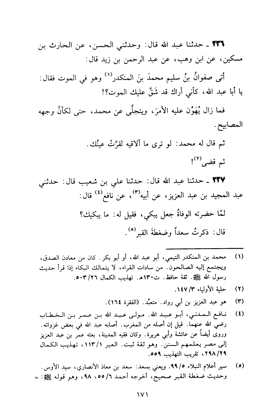 حَدَّثَنَا عَبْدُ اللَّهِ قَالَ: وَحَدَّثَنِي الْحَسَنُ، عَنِ الْحَارِثِ بْنِ مِسْكِينٍ، عَنِ ابْنِ وَهْبٍ، عَنْ عَبْدِ الرَّحْمَنِ بْنِ زَيْدٍ قَالَ: أَتَى صَفْوَانُ بْنُ سُلَيْمٍ مُحَمَّدَ بْنَ الْمُنْكَدِرِ وَهُوَ فِي الْمَوْتِ فَقَالَ: " يَا أَبَا عَبْدِ اللَّهِ، كَأَنِّي أَرَاكَ قَدْ شَقَّ عَلَيْكَ الْمَوْتُ؟ فَمَا زَالَ يُهَوِّنُ عَلَيْهِ الْأَمْرَ، وَيَتَجَلَّى عَنْ مُحَمَّدٍ، حَتَّى لَكَأَنَّ وَجْهَهُ الْمَصَابِيحُ. ثُمَّ قَالَ لَهُ مُحَمَّدٌ: «§لَوْ تَرَى مَا أُلَاقِيهِ لَقَرَّتْ عَيْنُكَ. ثُمَّ قَضَى»