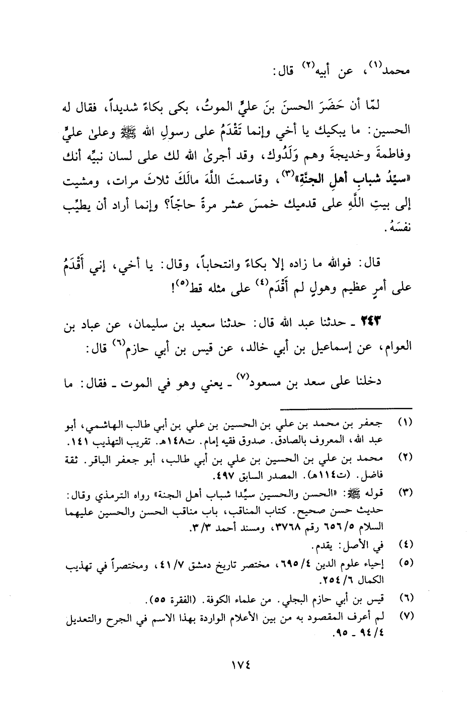 حَدَّثَنَا عَبْدُ اللَّهِ قَالَ: حَدَّثَنَا سَعِيدُ بْنُ سُلَيْمَانَ، عَنْ عَبَّادِ بْنِ الْعَوَّامِ، عَنْ إِسْمَاعِيلَ بْنِ أَبِي خَالِدٍ، عَنْ قَيْسِ بْنِ أَبِي حَازِمٍ قَالَ: دَخَلْنَا عَلَى سَعْدِ بْنِ مَسْعُودٍ - يَعْنِي وَهُوَ فِي الْمَوْتِ - فَقَالَ: «§مَا -[175]- أَدْرِي مَا تَقُولُونَ؟ غَيْرَ أَنَّهُ لَيْتَ مَا فِي تَابُوتِي نَارٌ فَلَمَّا مَاتَ نَظَرُوا فَإِذَا فِيهِ أَلْفٌ أَوْ أَلْفَانِ»