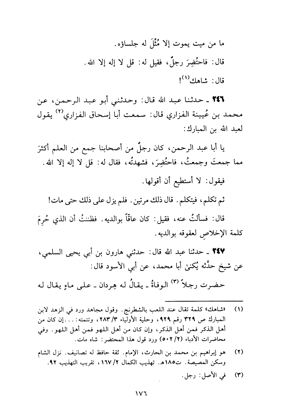 حَدَّثَنَا عَبْدُ اللَّهِ قَالَ: وَحَدَّثَنِي أَبُو عَبْدِ الرَّحْمَنِ، عَنْ مُحَمَّدِ بْنِ عُيَيْنَةَ الْفَزَارِيِّ قَالَ: سَمِعْتُ أَبَا إِسْحَاقَ الْفَزَارِيَّ يَقُولُ لِعَبْدِ اللَّهِ بْنِ الْمُبَارَكِ: " يَا أَبَا عَبْدِ الرَّحْمَنِ، كَانَ §رَجُلٌ مِنْ أَصْحَابِنَا جَمَعَ مِنَ الْعِلْمِ أَكْثَرَ مِمَّا جَمَعْتَ وَجَمَعْتُ، فَاحْتُضِرَ، فَشَهِدْتُهُ، فَقَالَ لَهُ: قُلْ لَا إِلَهَ إِلَّا اللَّهُ. فَيَقُولُ: لَا أَسْتَطِيعُ أَنْ أَقُولَهَا. ثُمَّ تَكَلَّمَ، فَيَتَكَلَّمُ. قَالَ ذَلِكَ مَرَّتَيْنِ. فَلَمْ يَزَلْ عَلَى ذَلِكَ حَتَّى مَاتَ قَالَ: فَسَأَلْتُ عَنْهُ، فَقِيلَ: كَانَ عَاقًّا بِوَالِدَيْهِ. فَظَنَنْتُ أَنَّ الَّذِي حُرِمَ كَلِمَةَ الْإِخْلَاصِ لِعُقُوقِهِ بِوَالِدَيْهِ "