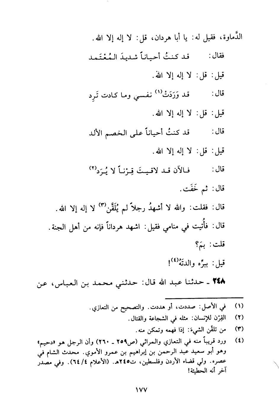 حَدَّثَنَا عَبْدُ اللَّهِ قَالَ: حَدَّثَنِي مُحَمَّدُ بْنُ الْعَبَّاسِ، عَنِ -[178]- الْعَبَّاسِ بْنِ طَالِبٍ قَالَ: قَالَ الرَّبِيعُ بْنُ بَرَّةَ: " §رَأَيْتُ بِالْأَهْوَازِ رَجُلًا يُقَالُ لَهُ وَهُوَ فِي الْمَوْتِ: يَا فُلَانُ، قُلْ لَا إِلَهَ إِلَّا اللَّهُ. قَالَ: ده دوازده، ده شازده، ده جهارده قَالَ: وَرَأَيْتُ بِالشَّامِ رَجُلًا يُقَالُ لَهُ وَهُوَ فِي الْمَوْتِ: قُلْ لَا إِلَهَ إِلَّا اللَّهُ. فَقَالَ: اشْرَبْ وَاسْقِهِ وَقَدْ قِيلَ لِرَجُلٍ هَا هُنَا بِالْمَعَرَّةِ: قُلْ لَا إِلَهَ إِلَّا اللَّهُ، فَقَالَ: