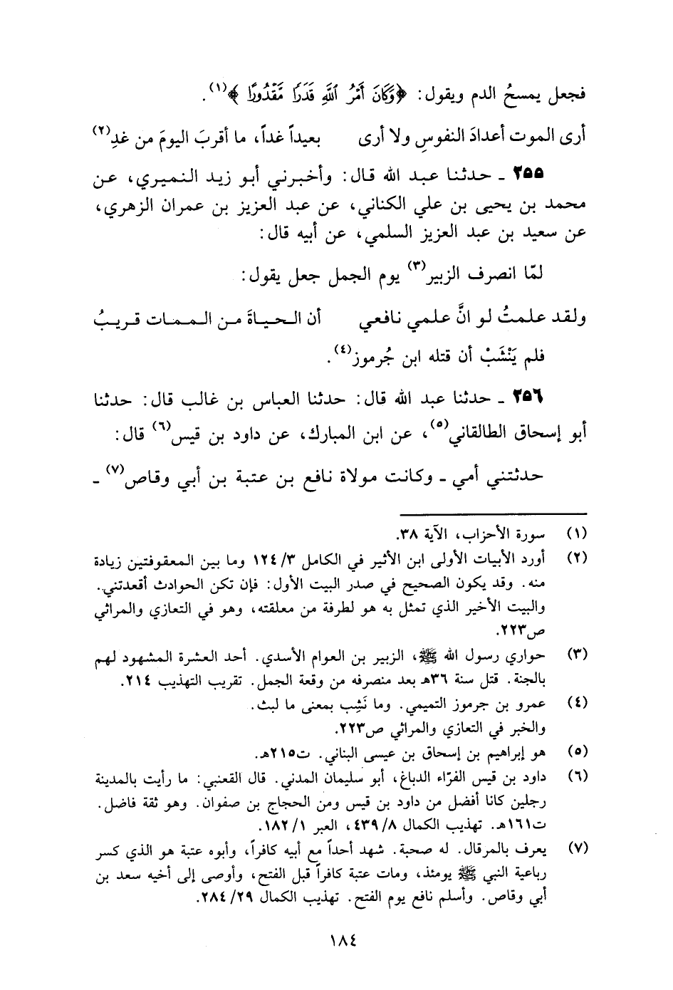 255 - حَدَّثَنَا عَبْدُ اللَّهِ قَالَ: وَأَخْبَرَنِي أَبُو زَيْدٍ النُّمَيْرِيُّ، عَنْ مُحَمَّدِ بْنِ يَحْيَى بْنِ عَلِيٍّ الْكِنَانِيِّ، عَنْ عَبْدِ الْعَزِيزِ بْنِ عِمْرَانَ الزُّهْرِيِّ، عَنْ سَعِيدِ بْنِ عَبْدِ الْعَزِيزِ السُّلَمِيِّ، عَنْ أَبِيهِ قَالَ: لَمَّا انْصَرَفَ الزُّبَيْرُ يَوْمَ الْجَمَلِ جَعَلَ يَقُولُ: «