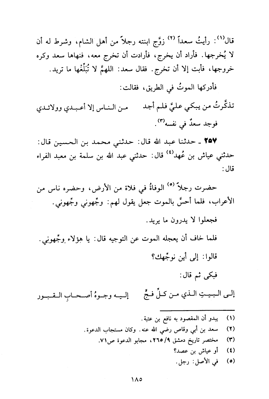 257 - حَدَّثَنَا عَبْدُ اللَّهِ قَالَ: حَدَّثَنِي مُحَمَّدُ بْنُ الْحُسَيْنِ قَالَ: حَدَّثَنِي عَيَّاشُ بْنُ عُهْدٍ قَالَ: حَدَّثَنِي عَبْدُ اللَّهِ بْنُ سَلَمَةَ بْنِ مَعْبَدٍ الْفَرَّاءُ قَالَ: " §حَضَرَتْ رَجُلًا الْوَفَاةُ فِي فَلَاةٍ مِنَ الْأَرْضِ، وَحَضَرَهُ نَاسٌ مِنَ الْأَعْرَابِ، فَلَمَّا أَحَسَّ بِالْمَوْتِ جَعَلَ يَقُولُ لَهُمْ: وَجِّهُونِي وَجِّهُونِي. فَجَعَلُوا لَا يَدْرُونَ مَا يُرِيدُ. فَلَمَّا خَافَ أَنْ يَعْجَلَهُ الْمَوْتُ عَنِ التَّوْجِيهِ قَالَ: يَا هَؤُلَاءِ وَجِّهُونِي. قَالُوا: إِلَى أَيْنَ نُوَجِّهُكَ؟ فَبَكَى ثُمَّ قَالَ: