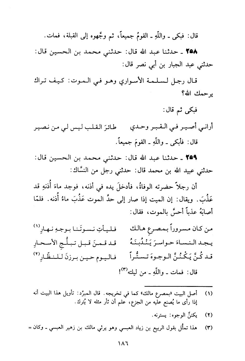 259 - حَدَّثَنَا عَبْدُ اللَّهِ قَالَ: حَدَّثَنِي مُحَمَّدُ بْنُ الْحُسَيْنِ قَالَ: حَدَّثَنِي عُبَيْدُ اللَّهِ بْنُ مُحَمَّدٍ قَالَ: حَدَّثَنِي رَجُلٌ مِنَ النُّسَّاكِ: أَنَّ §رَجُلًا حَضَرَتْهُ الْوَفَاةُ، فَأَدْخَلَ يَدَهُ فِي أُذُنِهِ، فَوَجَدَ مَاءَ أُذُنِهِ قَدْ عَذُبَ. وَيُقَالَ إِنَّ الْمَيِّتَ إِذَا صَارَ إِلَى حَدِّ الْمَوْتِ عَذُبَ مَاءُ أُذُنِهِ. فَلَمَّا أَصَابَهُ عَذْبًا أَحَسَّ بِالْمَوْتِ، فَقَالَ: