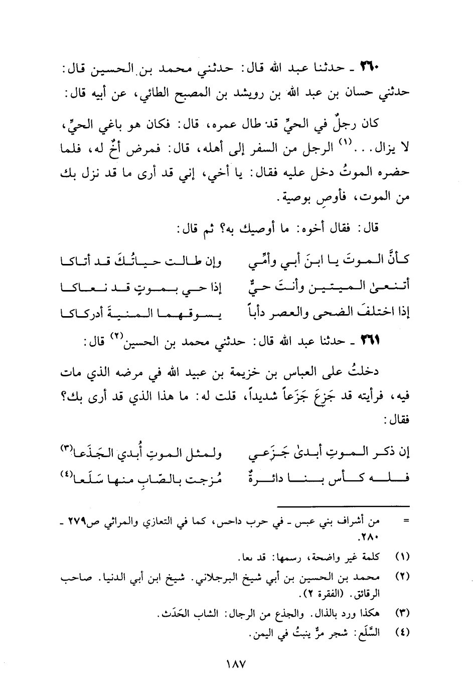 260 - حَدَّثَنَا عَبْدُ اللَّهِ قَالَ: حَدَّثَنِي مُحَمَّدُ بْنُ الْحُسَيْنِ قَالَ: حَدَّثَنِي حَسَّانُ بْنُ عَبْدِ اللَّهِ بْنِ رُوَيْشِدِ بْنِ الْمُصَبِّحِ الطَّائِيُّ، عَنْ أَبِيهِ قَالَ: كَانَ §رَجُلٌ فِي الْحَيِّ قَدْ طَالَ عُمْرُهُ، قَالَ: فَكَانَ هُوَ بَاغِيَ الْحَيِّ، لَا يَزَالُ. . . . الرَّجُلُ مِنَ السَّفَرِ إِلَى أَهْلِهِ، قَالَ: فَمَرِضَ أَخٌ لَهُ، فَلَمَّا حَضَرَهُ الْمَوْتُ دَخَلَ عَلَيْهِ فَقَالَ: يَا أَخِي، إِنِّي قَدْ أَرَى مَا قَدْ نَزَلَ بِكَ مِنَ الْمَوْتِ، فَأَوْصِ بِوَصِيَّةٍ. قَالَ: فَقَالَ أَخُوهُ: مَا أُوصِيكَ بِهِ؟ ثُمَّ قَالَ: