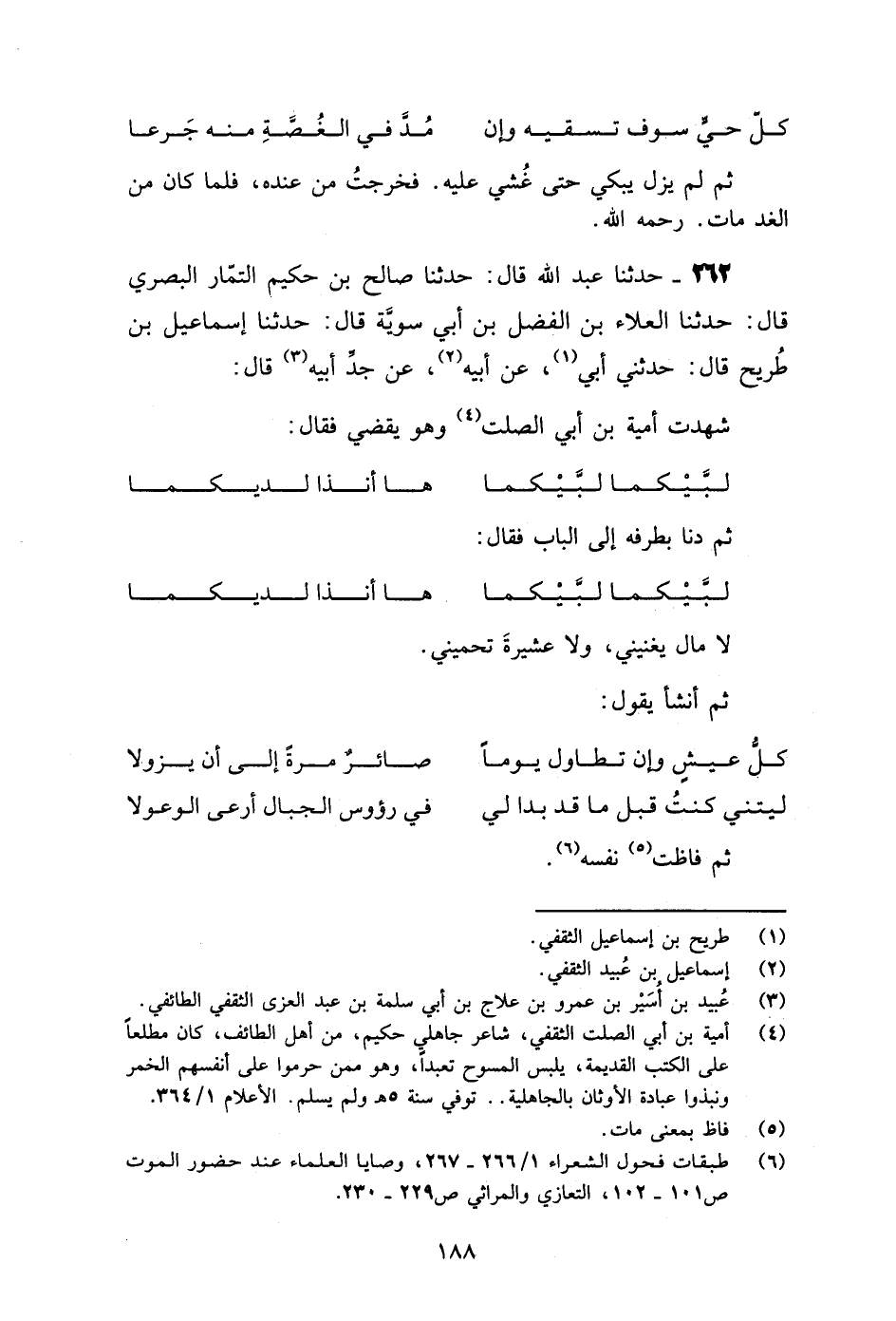 262 - حَدَّثَنَا عَبْدُ اللَّهِ قَالَ: حَدَّثَنَا صَالِحُ بْنُ حَكِيمٍ التَّمَّارُ الْبَصْرِيُّ قَالَ: حَدَّثَنَا الْعَلَاءُ بْنُ الْفَضْلِ بْنِ أَبِي سَوِيَّةَ قَالَ: حَدَّثَنَا إِسْمَاعِيلُ بْنُ طُرَيْحٍ قَالَ: حَدَّثَنِي أَبِي، عَنْ أَبِيهِ، عَنْ جَدِّ أَبِيهِ قَالَ: شَهِدْتُ أُمَيَّةَ بْنَ أَبِي الصَّلْتِ وَهُوَ يَقْضِي فَقَالَ: