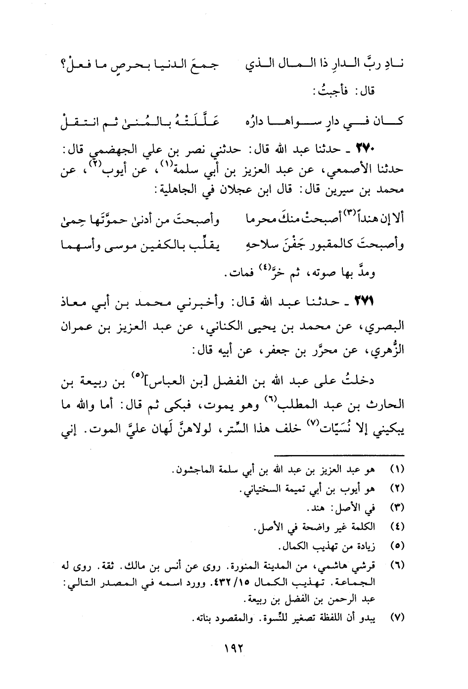 271 - حَدَّثَنَا عَبْدُ اللَّهِ قَالَ: وَأَخْبَرَنِي مُحَمَّدُ بْنُ أَبِي مُعَاذٍ الْبَصْرِيُّ، عَنْ مُحَمَّدِ بْنِ يَحْيَى الْكِنَانِيِّ، عَنْ عَبْدِ الْعَزِيزِ بْنِ عِمْرَانَ الزُّهْرِيِّ، عَنْ مُحَرَّرِ بْنِ جَعْفَرٍ، عَنْ أَبِيهِ قَالَ: دَخَلْتُ عَلَى عَبْدِ اللَّهِ بْنِ الْفَضْلِ بْنِ الْعَبَّاسِ بْنِ رَبِيعَةَ بْنِ الْحَارِثِ بْنِ عَبْدِ الْمُطَّلِبِ وَهُوَ يَمُوتُ، فَبَكَى ثُمَّ قَالَ: " أَمَا وَاللَّهِ §مَا يُبْكِينِي إِلَّا نُسَيَّاتٍ خَلْفَ هَذَا السِّتْرِ، لَوْلَاهُنَّ لَهَانَ عَلَيَّ الْمَوْتُ. إِنِّي -[193]- لَمُؤْمِنٌ بِاللَّهِ، وَإِنِّي لَتَائِبٌ إِلَى اللَّهِ، وَإِنَّ اللَّهَ لَغَفُورٌ. قَالَ: قُلْتُ: أَيْ أَخِي، الَّذِي رَجَوْتَهُ لِمَغْفِرَةِ ذَنْبِكَ فَارْجُهُ لِخَيْرِ بَنَاتِكَ، فَمَغْفِرَةُ الذَّنْبِ أَعْظَمُ مِنَ الرِّزْقِ. فَقَالَ عَبْدُ اللَّهِ: جَزَاكَ اللَّهُ خَيْرًا. صَدَقْتَ "