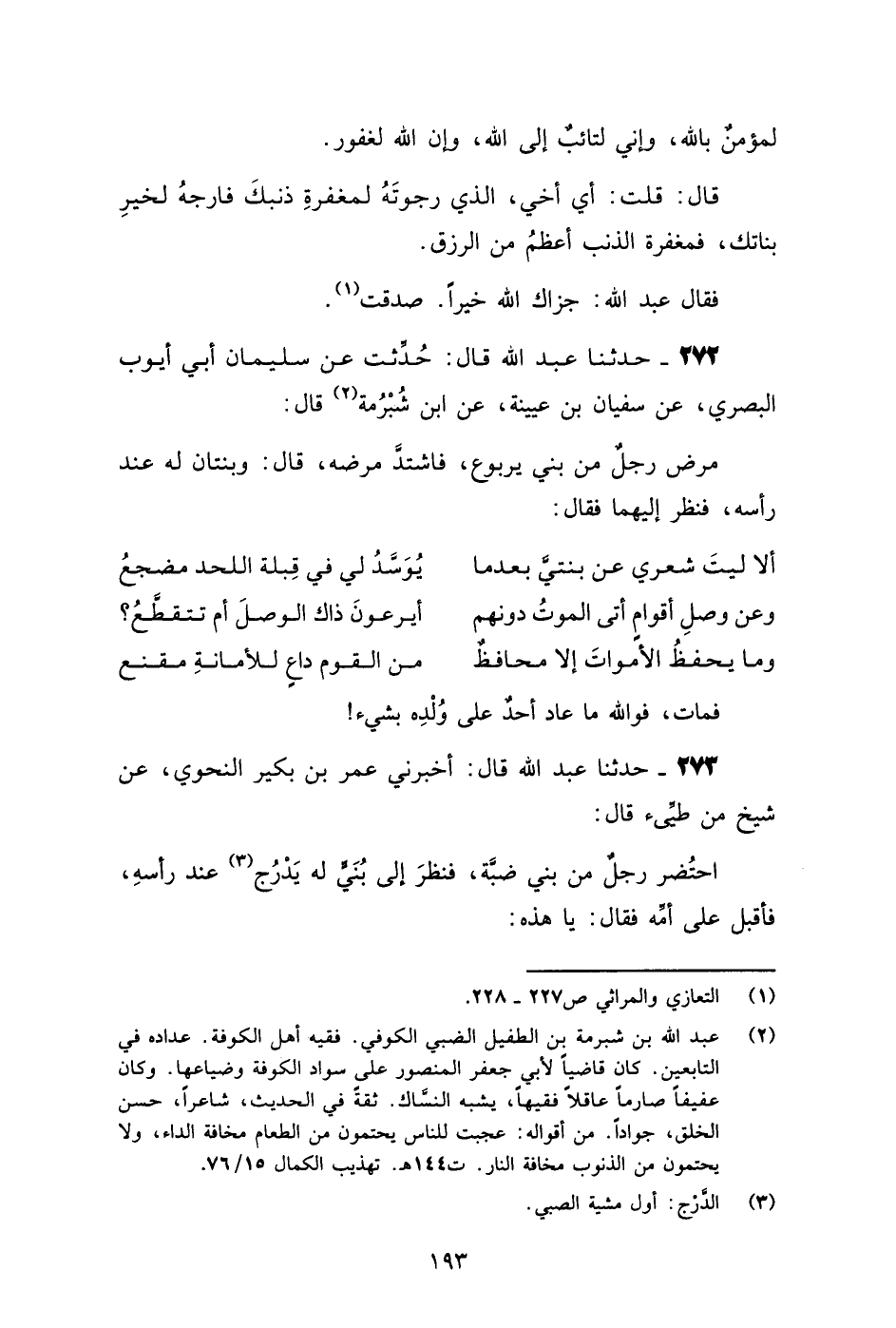 273 - حَدَّثَنَا عَبْدُ اللَّهِ قَالَ: أَخْبَرَنِي عُمَرُ بْنُ بُكَيْرٍ النَّحْوِيُّ، عَنْ شَيْخٍ مِنْ طَيِّئٍ قَالَ: " §احْتُضِرَ رَجُلٌ مِنْ بَنِي ضَبَّةَ، فَنَظَرَ إِلَى بُنَيٍّ لَهُ يَدْرُجُ عِنْدَ رَأْسِهِ، فَأَقْبَلَ عَلَى أُمِّهِ فَقَالَ: يَا هَذِهِ: