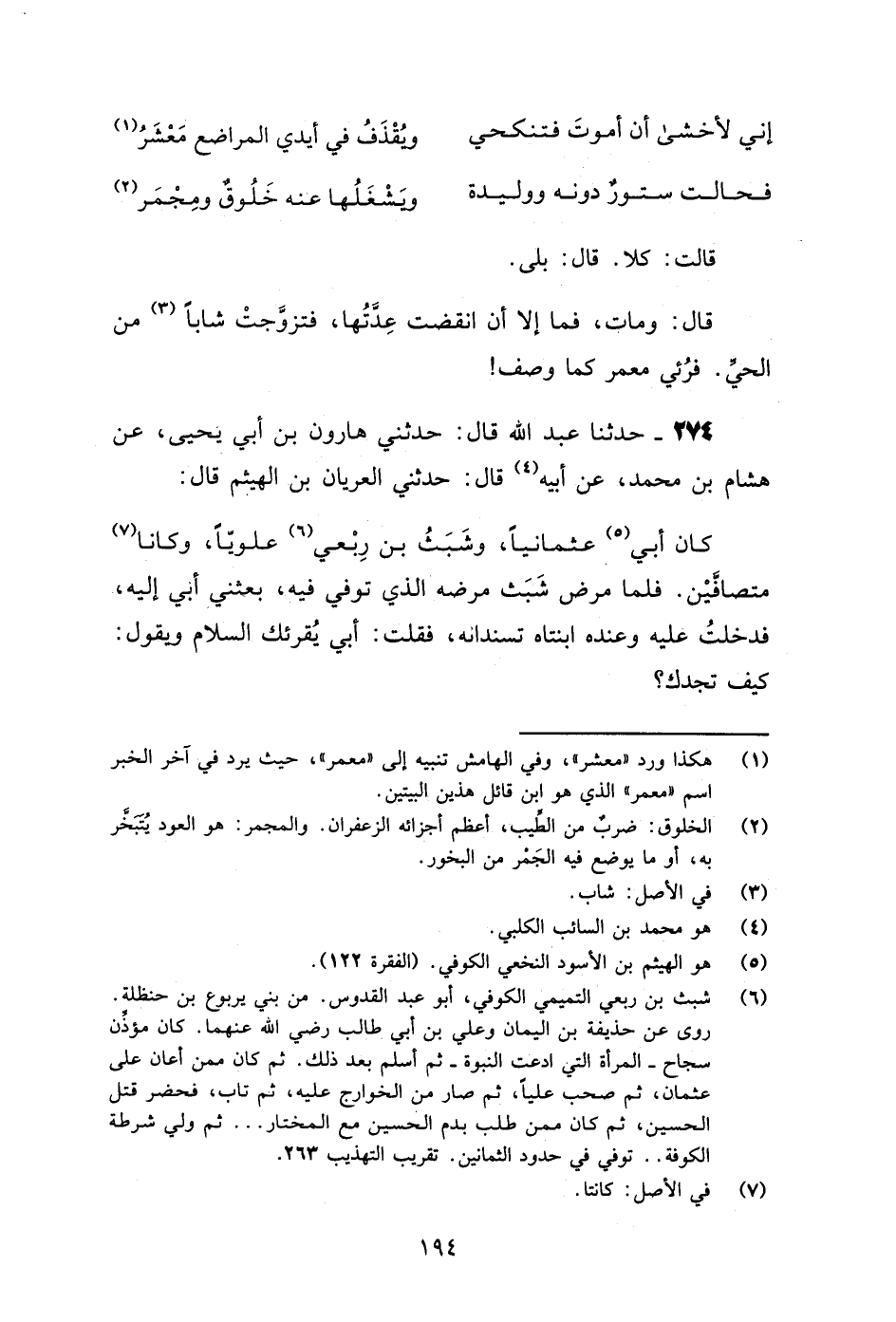 274 - حَدَّثَنَا عَبْدُ اللَّهِ قَالَ: حَدَّثَنِي هَارُونُ بْنُ أَبِي يَحْيَى، عَنْ هِشَامِ بْنِ مُحَمَّدٍ، عَنْ أَبِيهِ قَالَ: حَدَّثَنِي الْعُرْيَانُ بْنُ الْهَيْثَمِ قَالَ: " §كَانَ أَبِي عُثْمَانِيًّا، وَشَبَثُ بْنُ رِبْعِيٍّ عَلَوِيًّا، وَكَانَا مُتَصَافَّيْنِ. فَلَمَّا مَرِضَ شَبَثٌ مَرَضَهُ الَّذِي تُوُفِّيَ فِيهِ، بَعَثَنِي أَبِي إِلَيْهِ، فَدَخَلْتُ عَلَيْهِ وَعِنْدَهُ ابْنَتَاهُ تَسْنِدَانِهِ، فَقُلْتُ: أَبِي يُقْرِئُكَ السَّلَامَ وَيَقُولُ: كَيْفَ تَجِدُكَ؟ -[195]- قَالَ: أَجِدُنِي فِي آخِرِ يَوْمِ الدُّنْيَا، وَأَوَّلِ يَوْمٍ مِنَ الْآخِرَةِ، فَأَقْرِئْ أَبَاكَ السَّلَامَ. ثُمَّ الْتَفَتَ إِلَى ابْنَتَيْهِ، فَقَالَ مُتَمَثِّلًا بِقَوْلِ لَبِيدٍ: