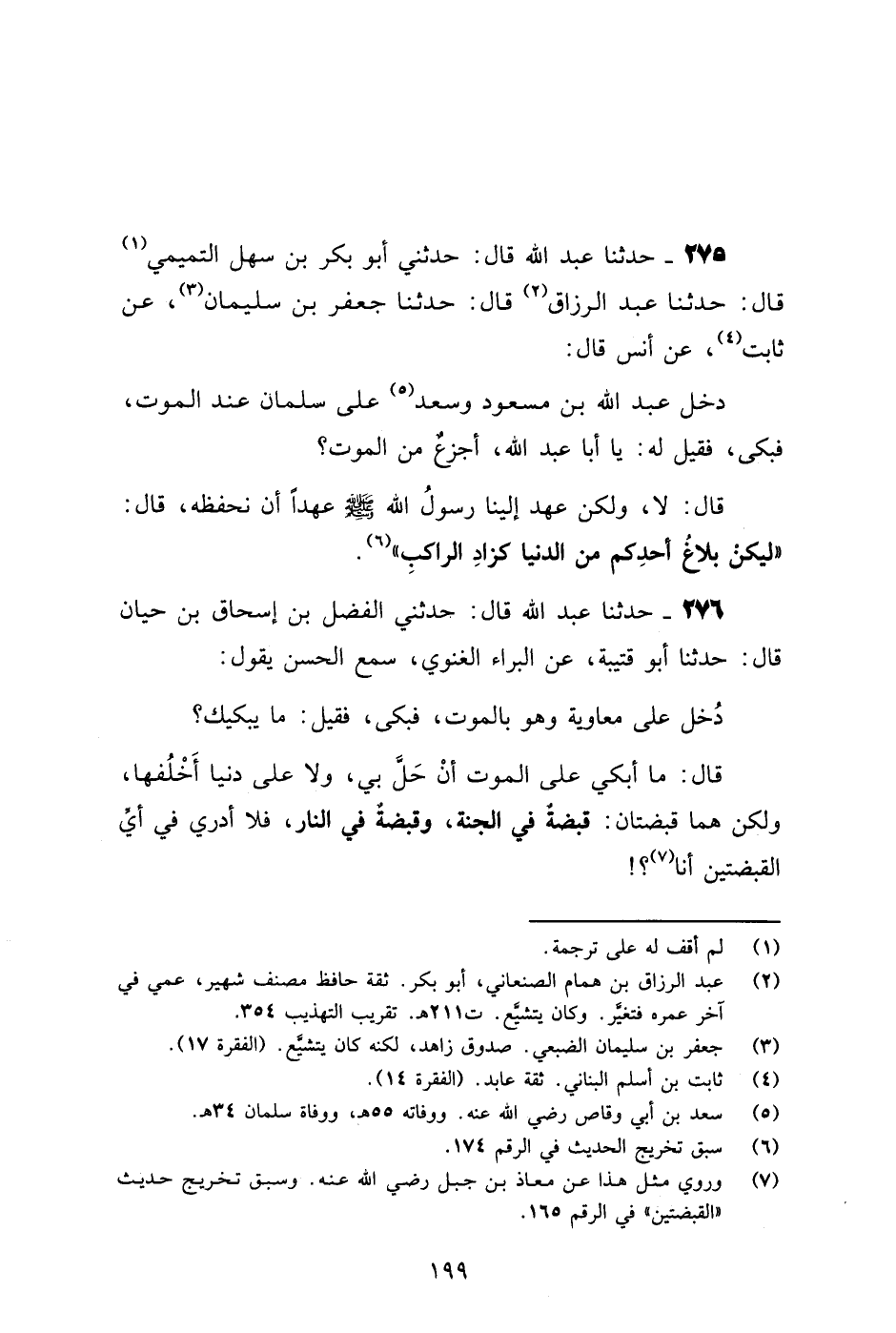 275 - حَدَّثَنَا عَبْدُ اللَّهِ قَالَ: حَدَّثَنِي أَبُو بَكْرِ بْنُ سَهْلٍ التَّمِيمِيُّ قَالَ: حَدَّثَنَا عَبْدُ الرَّازَّقِ قَالَ: حَدَّثَنَا جَعْفَرُ بْنُ سُلَيْمَانَ، عَنْ ثَابِتٍ، عَنْ أَنَسٍ قَالَ: دَخَلَ عَبْدُ اللَّهِ بْنُ مَسْعُودٍ وَسَعْدٌ عَلَى سَلْمَانَ عِنْدَ الْمَوْتِ، فَبَكَى، فَقِيلَ لَهُ: يَا أَبَا عَبْدِ اللَّهِ، أَجَزَعٌ مِنَ الْمَوْتِ؟ قَالَ: " لَا، وَلَكِنْ عَهِدَ إِلَيْنَا رَسُولُ اللَّهِ صَلَّى اللهُ عَلَيْهِ وَسَلَّمَ عَهْدًا أَنْ نَحْفَظَهُ، قَالَ: «§لِيَكُنْ بَلَاغُ أَحَدِكُمْ مِنَ الدُّنْيَا كَزَادِ الرَّاكِبِ»