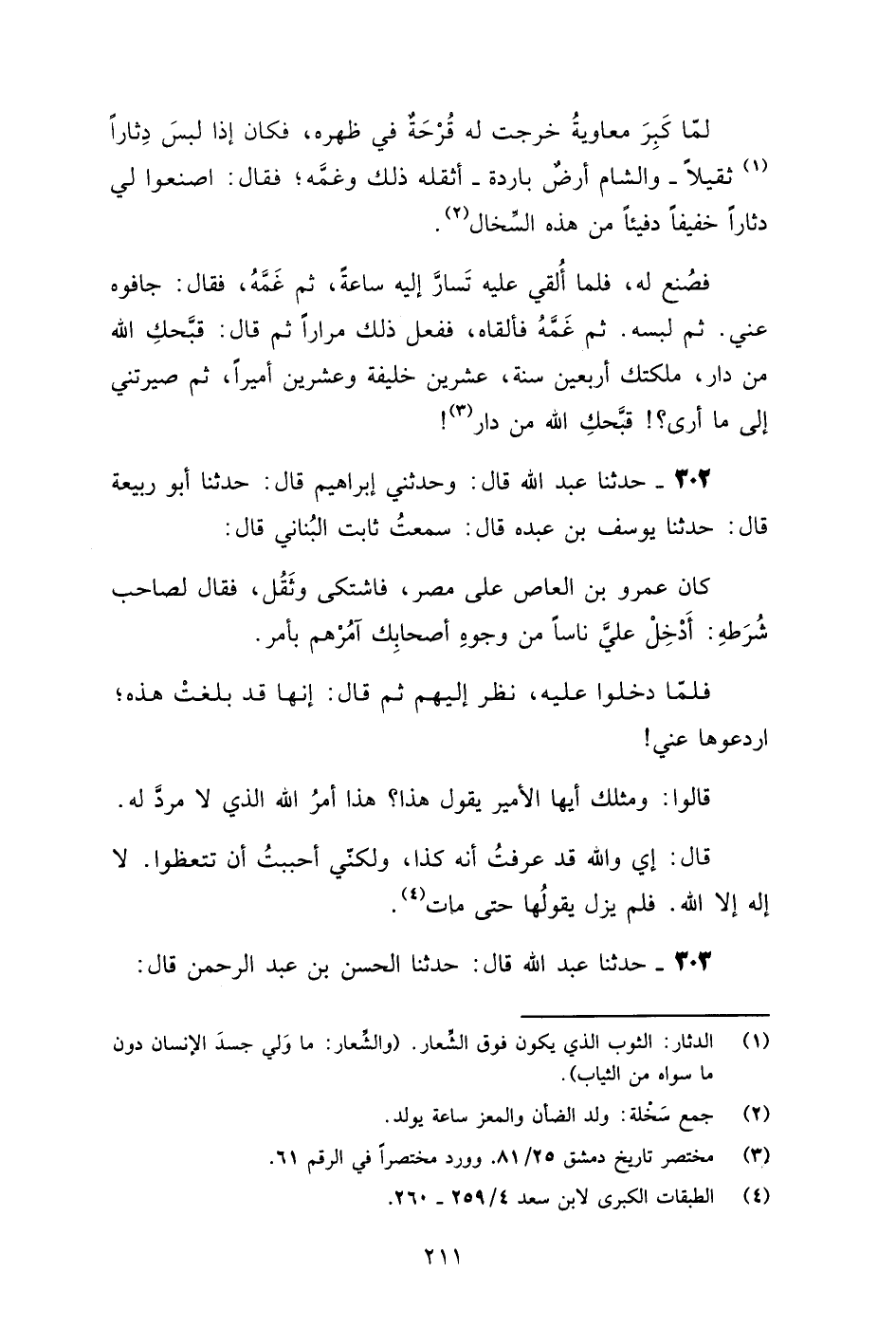 302 - حَدَّثَنَا عَبْدُ اللَّهِ قَالَ: وَحَدَّثَنِي إِبْرَاهِيمُ قَالَ: حَدَّثَنَا أَبُو رَبِيعَةَ قَالَ: حَدَّثَنَا يُوسُفُ بْنُ عَبْدَةَ قَالَ: سَمِعْتُ ثَابِتًا الْبُنَانِيَّ قَالَ: كَانَ عَمْرُو بْنُ الْعَاصِ عَلَى مِصْرَ، فَاشْتَكَى وَثَقُلَ، فَقَالَ لِصَاحِبِ شُرَطِهِ: أَدْخِلْ عَلَيَّ نَاسًا مِنْ وُجُوهِ أَصْحَابِكَ آمُرْهُمْ بِأَمْرٍ. فَلَمَّا دَخَلُوا عَلَيْهِ، نَظَرَ إِلَيْهِمْ ثُمَّ قَالَ: " إِنَّهَا §قَدْ بَلَغَتْ هَذِهِ، ارْدَعُوهَا عَنِّي، قَالُوا: وَمِثْلُكَ أَيُّهَا الْأَمِيرُ يَقُولُ هَذَا؟ هَذَا أَمْرُ اللَّهِ الَّذِي لَا مَرَدَّ لَهُ. قَالَ: إِي وَاللَّهِ قَدْ عَرَفْتُ أَنَّهُ كَذَا، وَلَكِنِّي أَحْبَبْتُ أَنْ تَتَّعِظُوا. لَا إِلَهَ إِلَّا اللَّهُ. فَلَمْ يَزَلْ يَقُولُهَا حَتَّى مَاتَ "