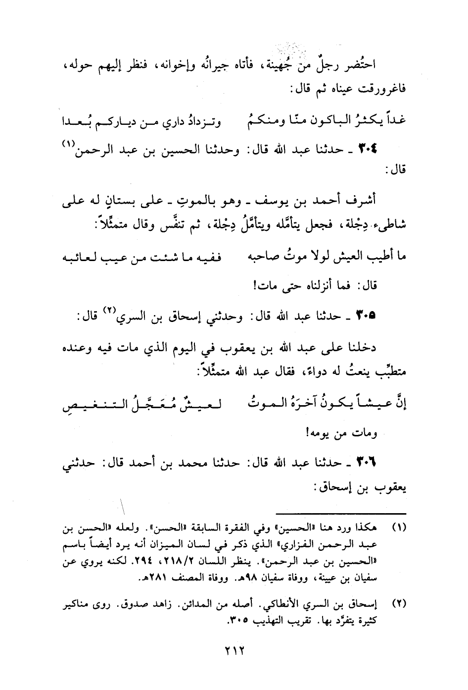 304 - حَدَّثَنَا عَبْدُ اللَّهِ قَالَ: وَحَدَّثَنَا الْحُسَيْنُ بْنُ عَبْدِ الرَّحْمَنِ قَالَ: أَشْرَفُ أَحْمَدُ بْنُ يُوسُفَ - وَهُوَ بِالْمَوْتِ - عَلَى بُسْتَانٍ لَهُ عَلَى شَاطِئِ دِجْلَةَ، فَجَعَلَ يَتَأَمَّلَهُ وَيَتَأَمَّلُ دِجْلَةَ، ثُمَّ تَنَفَّسَ وَقَالَ مُتَمَثِّلًا: