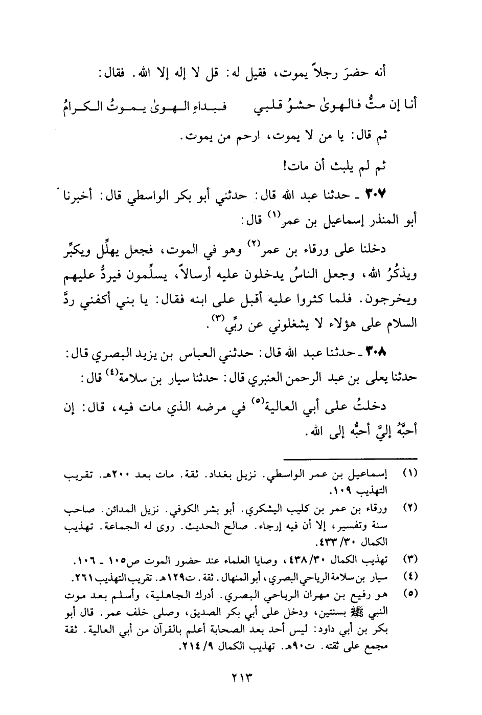 307 - حَدَّثَنَا عَبْدُ اللَّهِ قَالَ: حَدَّثَنِي أَبُو بَكْرٍ الْوَاسِطِيُّ قَالَ: أَخْبَرَنَا أَبُو الْمُنْذِرِ إِسْمَاعِيلُ بْنُ عُمَرَ قَالَ: دَخَلْنَا عَلَى وَرْقَاءَ بْنِ عُمَرَ وَهُوَ فِي الْمَوْتِ، فَجَعَلَ يُهَلِّلُ وَيُكَبِّرُ وَيَذْكُرُ اللَّهَ، وَجَعَلَ النَّاسُ يَدْخُلُونَ عَلَيْهِ أَرْسَالًا، يُسَلِّمُونَ فَيَرُدُّ عَلَيْهِمْ وَيَخْرُجُونَ. فَلَمَّا كَثُرُوا عَلَيْهِ أَقْبَلَ عَلَى ابْنِهِ فَقَالَ: «يَا بُنَيَّ §اكْفِنِي رَدَّ السَّلَامِ عَلَى هَؤُلَاءِ لَا يَشْغَلُونِي عَنْ رَبِّي»