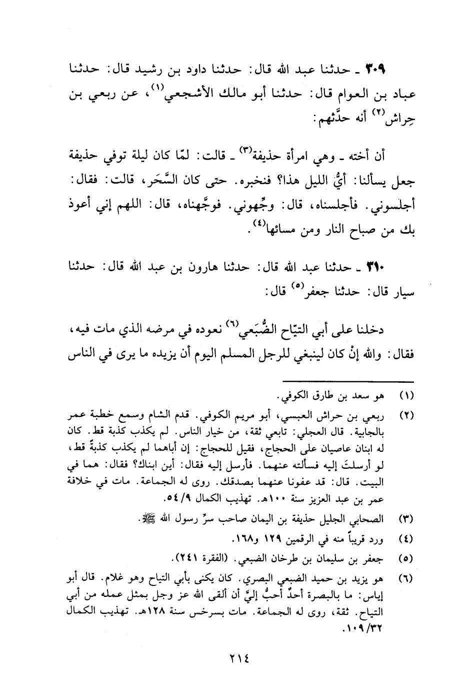 309 - حَدَّثَنَا عَبْدُ اللَّهِ قَالَ: حَدَّثَنَا دَاوُدُ بْنُ رُشَيْدٍ قَالَ: حَدَّثَنَا عَبَّادُ بْنُ الْعَوَّامِ قَالَ: حَدَّثَنَا أَبُو مَالِكٍ الْأَشْجَعِيُّ، عَنْ رِبْعِيِّ بْنِ حِرَاشٍ أَنَّهُ حَدَّثَهُمْ: أَنَّ أُخْتَهُ وَهِيَ امْرَأَةُ حُذَيْفَةَ قَالَتْ: لَمَّا كَانَ لَيْلَةُ تُوُفِّيَ حُذَيْفَةُ جَعَلَ يَسْأَلُنَا: أَيُّ اللَّيْلِ هَذَا؟ فَنُخْبِرُهُ. حَتَّى كَانَ السَّحَرُ، قَالَتْ: فَقَالَ: أَجْلِسُونِي. فَأَجْلَسْنَاهُ، قَالَ: وَجِّهُونِي. فَوَجَّهْنَاهُ، قَالَ: «اللَّهُمَّ إِنِّي §أَعُوذُ بِكَ مِنْ صَبَاحِ النَّارِ وَمِنْ مَسَائِهَا»