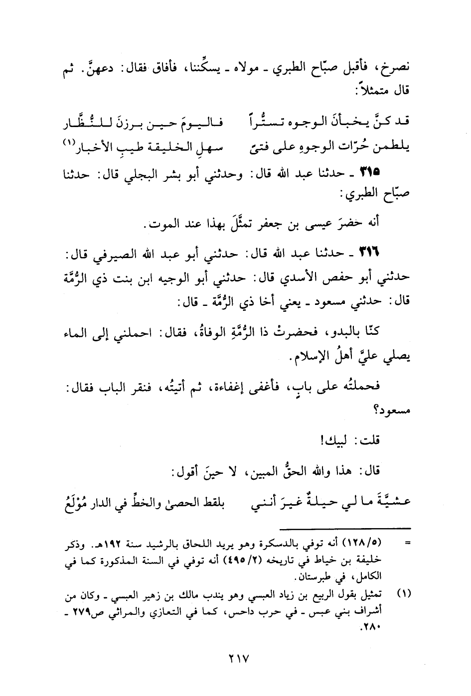 316 - حَدَّثَنَا عَبْدُ اللَّهِ قَالَ: حَدَّثَنِي أَبُو عَبْدِ اللَّهِ الصَّيْرَفِيُّ قَالَ: حَدَّثَنِي أَبُو حَفْصٍ الْأَسَدِيُّ قَالَ: حَدَّثَنِي أَبُو الْوَجِيهِ ابْنُ بِنْتِ ذِي الرُّمَّةِ قَالَ: حَدَّثَنِي مَسْعُودٌ يَعْنِي أَخَا ذِي الرُّمَّةِ قَالَ: كُنَّا بِالْبَدْوِ، فَحَضَرَتْ ذَا الرُّمَّةِ الْوَفَاةُ، فَقَالَ: " §احْمِلْنِي إِلَى الْمَاءِ يُصَلِّي عَلَيَّ أَهْلُ الْإِسْلَامِ، فَحَمَلْتُهُ عَلَى بَابٍ، فَأَغْفَى إِغْفَاءَةً، ثُمَّ أَتَيْتُهُ، فَنَقَرَ الْبَابَ فَقَالَ: مَسْعُودٌ؟ قُلْتُ: لَبَّيْكَ قَالَ: هَذَا وَاللَّهِ الْحَقُّ الْمُبِينُ، لَا حِينَ أَقُولُ: