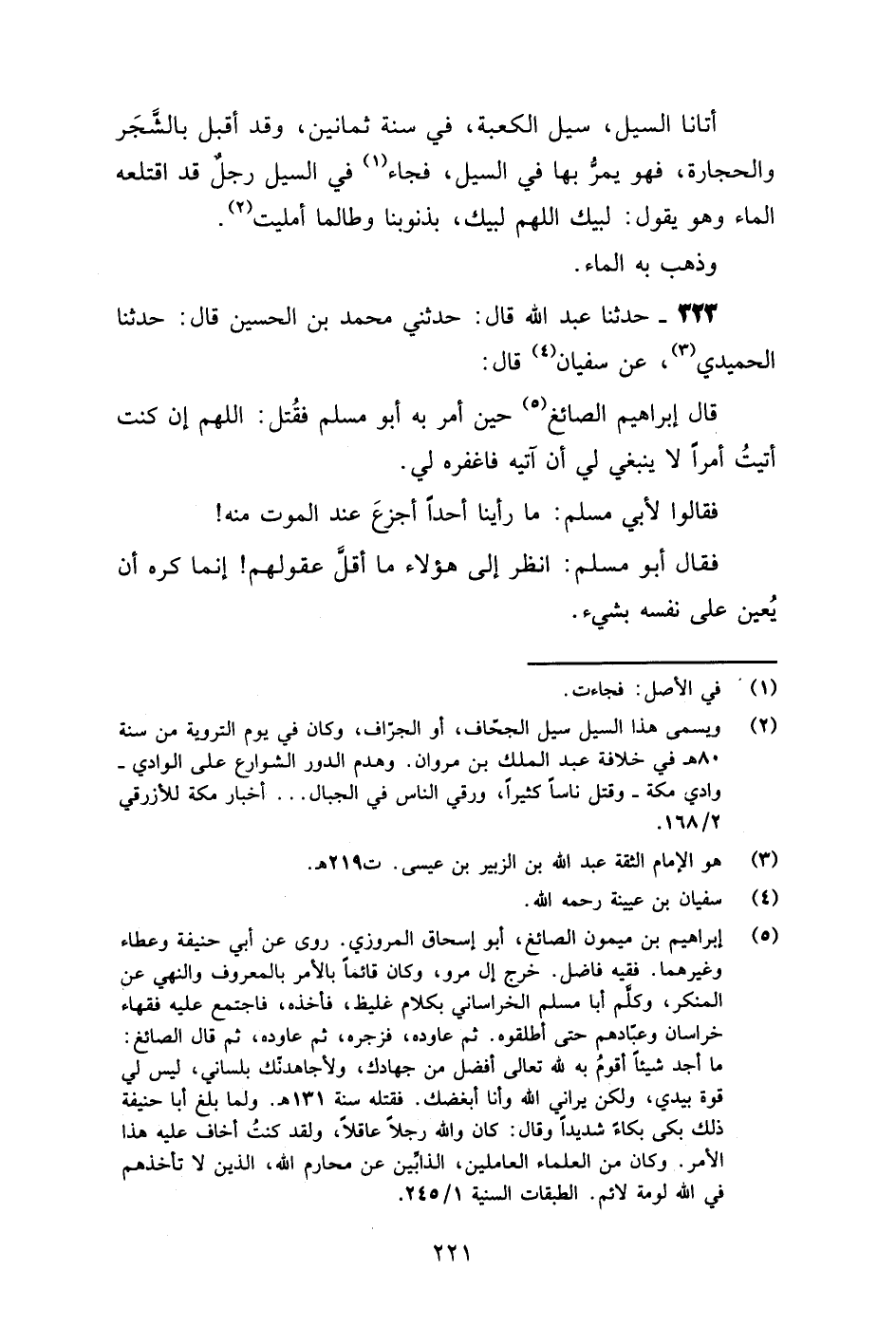 323 - حَدَّثَنَا عَبْدُ اللَّهِ قَالَ: حَدَّثَنِي مُحَمَّدُ بْنُ الْحُسَيْنِ قَالَ: حَدَّثَنَا الْحُمَيْدِيُّ، عَنْ سُفْيَانَ قَالَ: قَالَ إِبْرَاهِيمُ الصَّائِغُ حِينَ أَمَرَ بِهِ أَبُو مُسْلِمٍ فَقُتِلَ: " اللَّهُمَّ إِنْ كُنْتُ §أَتَيْتُ أَمْرًا لَا يَنْبَغِي لِي أَنْ آتِيَهُ فَاغْفِرْهُ لِي. فَقَالُوا لِأَبِي مُسْلِمٍ: مَا رَأَيْنَا أَحَدًا أَجْزَعَ عِنْدَ الْمَوْتِ مِنْهُ فَقَالَ أَبُو مُسْلِمٍ: انْظُرْ إِلَى هَؤُلَاءِ مَا أَقَلَّ عُقُولَهُمْ إِنَّمَا كَرِهَ أَنْ يُعِينَ عَلَى نَفْسِهِ بِشَيْءٍ "