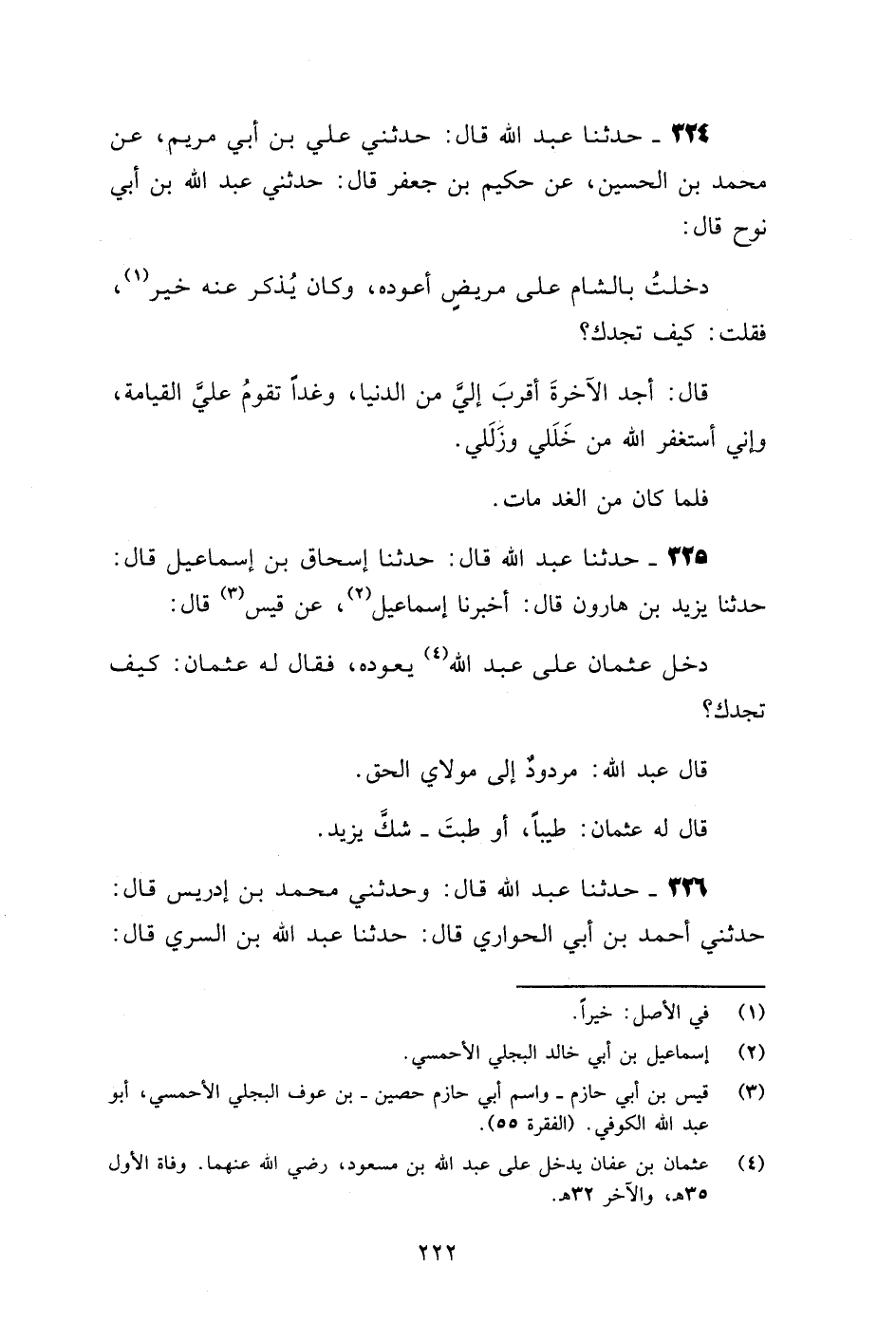 325 - حَدَّثَنَا عَبْدُ اللَّهِ قَالَ: حَدَّثَنَا إِسْحَاقُ بْنُ إِسْمَاعِيلَ قَالَ: حَدَّثَنَا يَزِيدُ بْنُ هَارُونَ قَالَ: أَخْبَرَنَا إِسْمَاعِيلُ، عَنْ قَيْسٍ قَالَ: دَخَلَ عُثْمَانُ عَلَى عَبْدِ اللَّهِ يَعُودُهُ، فَقَالَ لَهُ عُثْمَانُ: كَيْفَ تَجِدُكَ؟ قَالَ عَبْدُ اللَّهِ: " §مَرْدُودٌ إِلَى مَوْلَايَ الْحَقِّ، قَالَ لَهُ عُثْمَانُ: طَيِّبًا، أَوْ طِبْتَ " - شَكَّ يَزِيدُ -