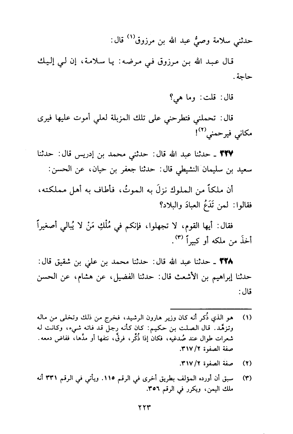 327 - حَدَّثَنَا عَبْدُ اللَّهِ قَالَ: حَدَّثَنِي مُحَمَّدُ بْنُ إِدْرِيسَ قَالَ: حَدَّثَنَا سَعِيدُ بْنُ سُلَيْمَانَ النَّشِيطِيُّ قَالَ: حَدَّثَنَا جَعْفَرُ بْنُ حَيَّانَ، عَنِ الْحَسَنِ: أَنَّ §مَلِكًا مِنَ الْمُلُوكِ نَزَلَ بِهِ الْمَوْتُ، فَأَطَافَ بِهِ أَهْلُ مَمْلَكَتِهِ، فَقَالُوا: لِمَنْ تَدَعُ الْعِبَادَ وَالْبِلَادَ؟ فَقَالَ: أَيُّهَا الْقَوْمُ، لَا تَجْهَلُوا، فَإِنَّكُمْ فِي مُلْكِ مَنْ لَا يُبَالِي أَصَغِيرًا أَخَذَ مِنْ مُلْكِهِ أَوْ كَبِيرًا