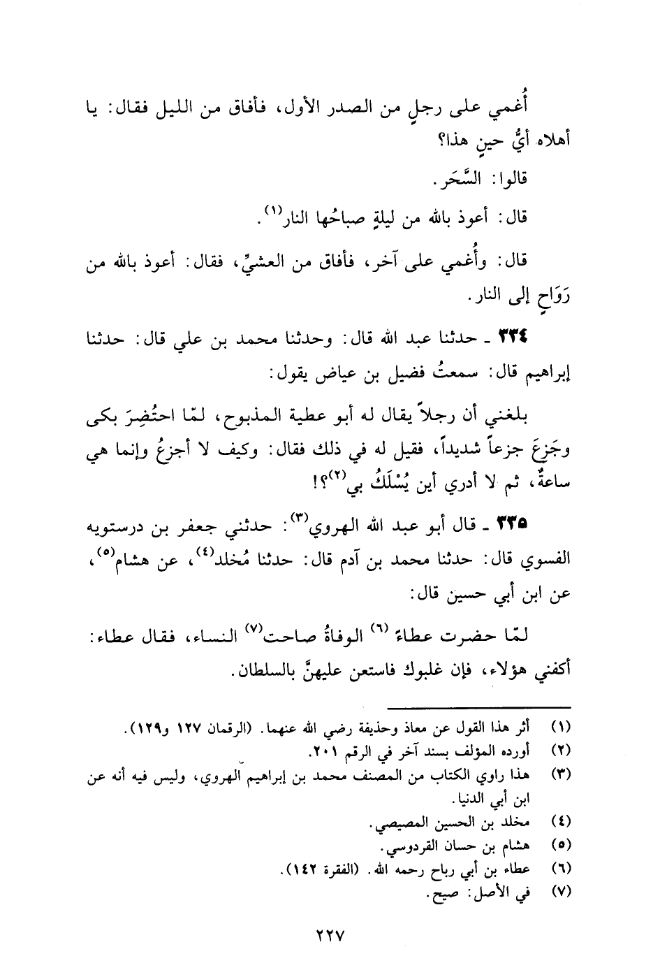 335 - قَالَ أَبُو عَبْدِ اللَّهِ الْهَرَوِيُّ: حَدَّثَنِي جَعْفَرُ بْنُ دُرُسْتَوَيْهِ الْفَسَوِيُّ قَالَ: حَدَّثَنَا مُحَمَّدُ بْنُ آدَمَ قَالَ: حَدَّثَنَا مَخْلَدٌ، عَنْ هِشَامٍ، عَنِ ابْنِ أَبِي حُسَيْنٍ قَالَ: لَمَّا حَضَرَتْ عَطَاءَ الْوَفَاةُ صَاحَتِ النِّسَاءُ، فَقَالَ عَطَاءٌ: " §اكْفِنِي هَؤُلَاءِ، فَإِنْ غَلَبُوكَ فَاسْتَعِنْ عَلَيْهِنَّ بِالسُّلْطَانِ -[228]-. ثُمَّ جَعَلَ يَقُولُ: يَا صَرِيخَ الْأَخْيَارِ، يَا صَرِيخَ الْأَخْيَارِ فَلَمْ يَزَلْ يَقُولُهَا حَتَّى قَضَى "