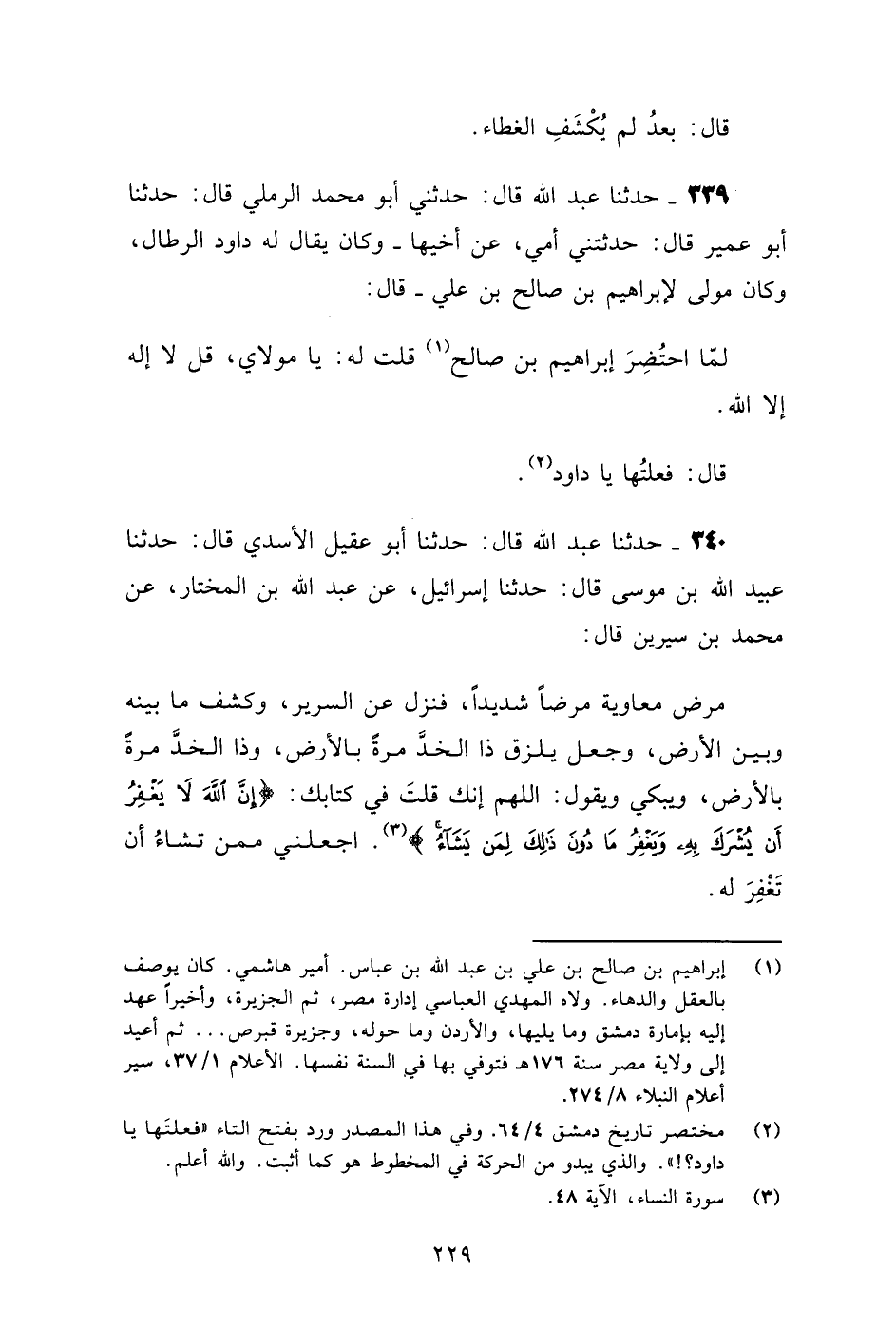 339 - حَدَّثَنَا عَبْدُ اللَّهِ قَالَ: حَدَّثَنِي أَبُو مُحَمَّدٍ الرَّمْلِيُّ قَالَ: حَدَّثَنَا أَبُو عُمَيْرٍ قَالَ: حَدَّثَتْنِي أُمِّي، عَنْ أَخِيهَا وَكَانَ يُقَالَ لَهُ دَاوُدُ الرَّطَّالُ وَكَانَ مَوْلًى لَإِبْرَاهِيمَ بْنِ صَالِحِ بْنِ عَلِيٍّ قَالَ: لَمَّا احْتُضِرَ إِبْرَاهِيمُ بْنُ صَالِحٍ قُلْتُ لَهُ: يَا مَوْلَايَ، قُلْ لَا إِلَهَ إِلَّا اللَّهُ. قَالَ: «§فَعَلْتُهَا يَا دَاوُدُ»