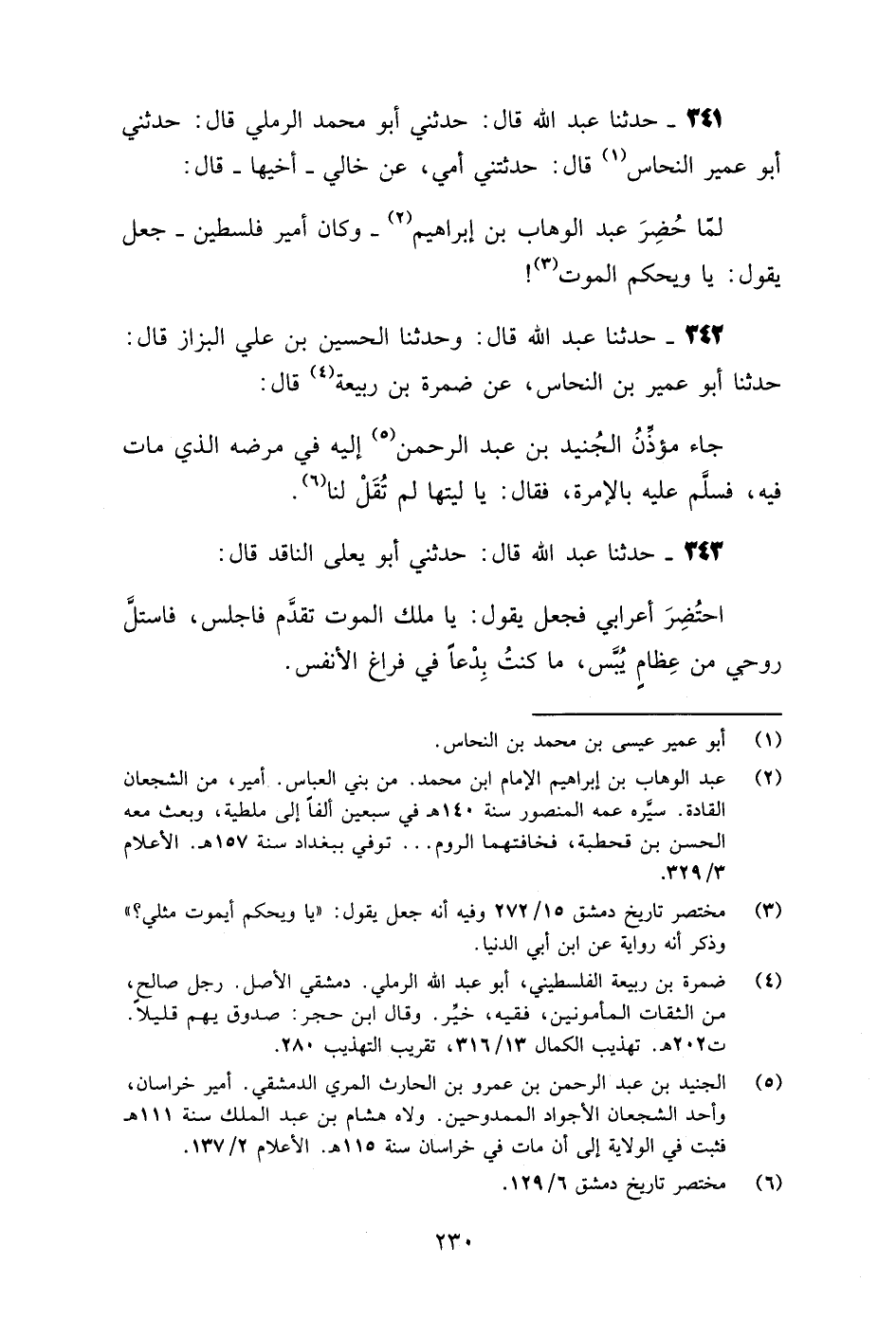 341 - حَدَّثَنَا عَبْدُ اللَّهِ قَالَ: حَدَّثَنِي أَبُو مُحَمَّدٍ الرَّمْلِيُّ قَالَ: حَدَّثَنِي أَبُو عُمَيْرٍ النَّحَّاسُ قَالَ: حَدَّثَتْنِي أُمِّي، عَنْ خَالِي أَخِيهَا، قَالَ: لَمَّا حُضِرَ عَبْدُ الْوَهَّابِ بْنُ إِبْرَاهِيمَ - وَكَانَ أَمِيرَ فِلَسْطِينَ - جَعَلَ يَقُولُ: «يَا §وَيْحَكُمُ الْمَوْتَ»