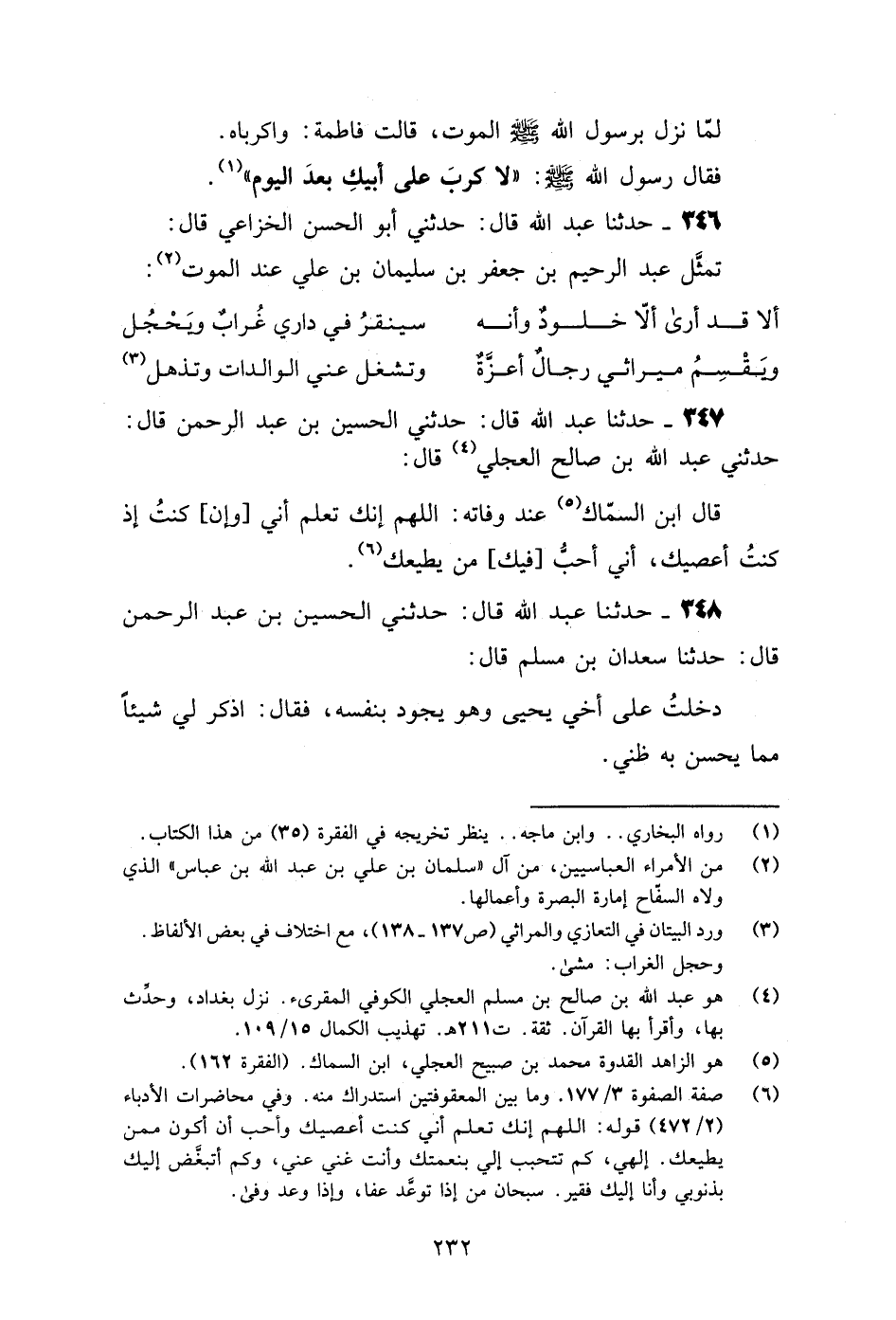 346 - حَدَّثَنَا عَبْدُ اللَّهِ قَالَ: حَدَّثَنِي أَبُو الْحَسَنِ الْخُزَاعِيُّ قَالَ: تَمَثَّلَ عَبْدُ الرَّحِيمِ بْنُ جَعْفَرِ بْنِ سُلَيْمَانَ بْنِ عَلِيٍّ عِنْدَ الْمَوْتِ: