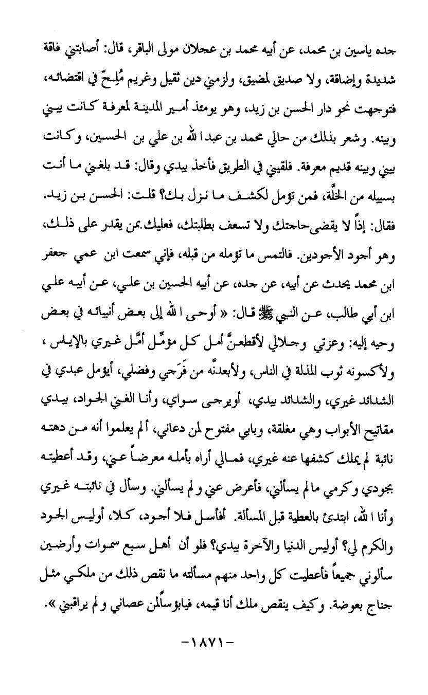 جده ياسين بن محمد عن أيبه محمد بن عجلان مولى الباقر قال أصابتني فاقة شديدة وإضاقة ولا صديق لمضيق ولزمني دين ثقيل وغريم ملح في اقتضائه فتوجهت نحو دار الحسن بن زيد وهو يومئذ أمير المدينة لمعرفة كانت بيني وبينه وشعر بذلك من حالي محمد بن عبد الله بن علي بن الحسين وكانت بيني وبينه قديم معرفة فليقيني في الطريق فأخذ بيدي وقال قد بلغني ما أنت بسبيله من الخلة فمن تؤمل لكشف ما نزل بك قلت الحسن بن زيد فقال إذا لا يقضى حاجتك ولا تسعف بطلبتك فعليك بمن يقدر على ذلك وهو أجود الأجودين فالتمس ما تؤمله من قبله فإني سمعت ابن عمي جعفر ابن محمد يحدث عن أبيه عن جده عن أبيه الحسين بن علي عن أبيه علي بن أبي طالب عن النبي صلى الله عليه وسلم قال أوحى الله إلى بعض أنبيائه في بعض وحيه إليه وعزتي وجلالي لأقطعن أمل كل مؤمل أمل غيري بالإياس ولأكسونه ثوب المذلة في الناس ولأبعدنه من فرجي وفضلي أيؤمل عبدي في الشدائد غيري والشدائد بيدي أويرجى سواي وأنا الغني الجواد بيدي مفاتيح الأبواب وهي مغلقة وبابي مفتوح لمن دعاني ألم يعلموا أنه من دهته نائبة لم يملك كشفها عنه غيري فمالي أراه بأمله معرضا عني وقد أعطيته بجودي وكرمي ما لم يسألني فأعرض عني ولم يسألني وسال في نائبته غيري وأنا الله ابتدئ بالعطية قبل المسألة أفسأل فلا أجود كلا أو ليس الجود والكرم لي أو ليس الدنيا والآخرة بيدي فلو أن أهل سبع سموات وأرضعين سألوني جميعا فأعطيت كل واحد منهم مسألته ما نقص ذلك من ملكي مثل جناح بعوضة وكيف ينقص ملك أنا قيمه فيابؤسا لمن عصاني ولم يراقبني