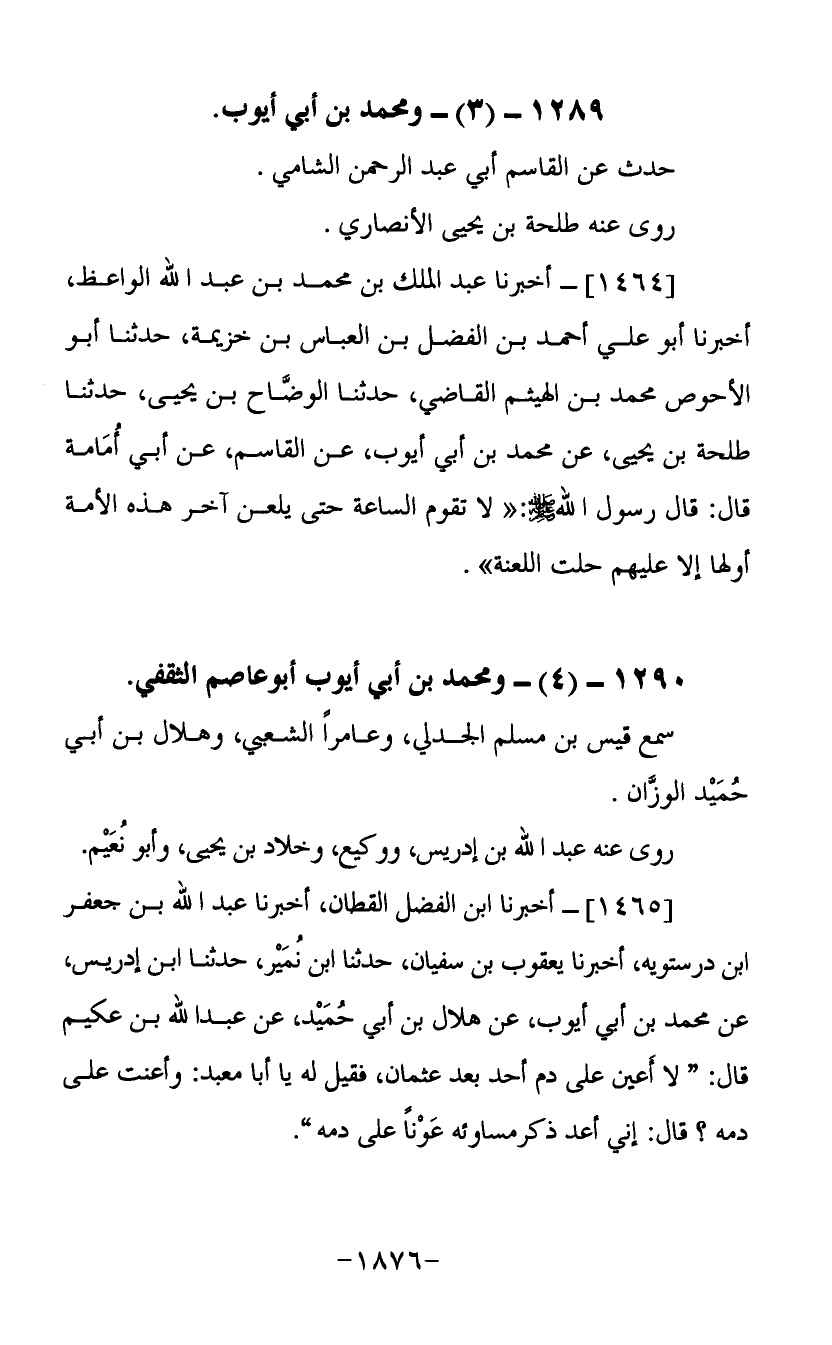 (1465) أخبرنا ابن الفضل القطان أخبرنا عبد الله بن جعفر بن درستويه أخبرنا يعقوب بن سفيان حدثنا ابن نمير حدثنا ابن إدريس عن محمد بن أبي أيوب عن هلال عن أبي حميد عن عبد الله بن عكيم قال لا أعين على دم أحد بعد عثمان فقيل له يا أبا معبد وأعنت على دمه قال إني أعد ذكر مساوئه عونا على دمه.
