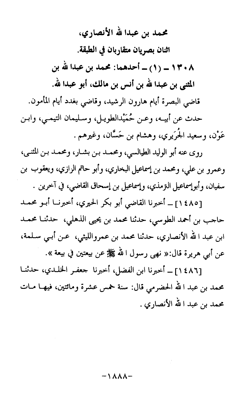 1308- (1) أحدهما محمد بن عبد الله بن المثنى بن عبد الله بن أنس بن مالك أبو عبد الله