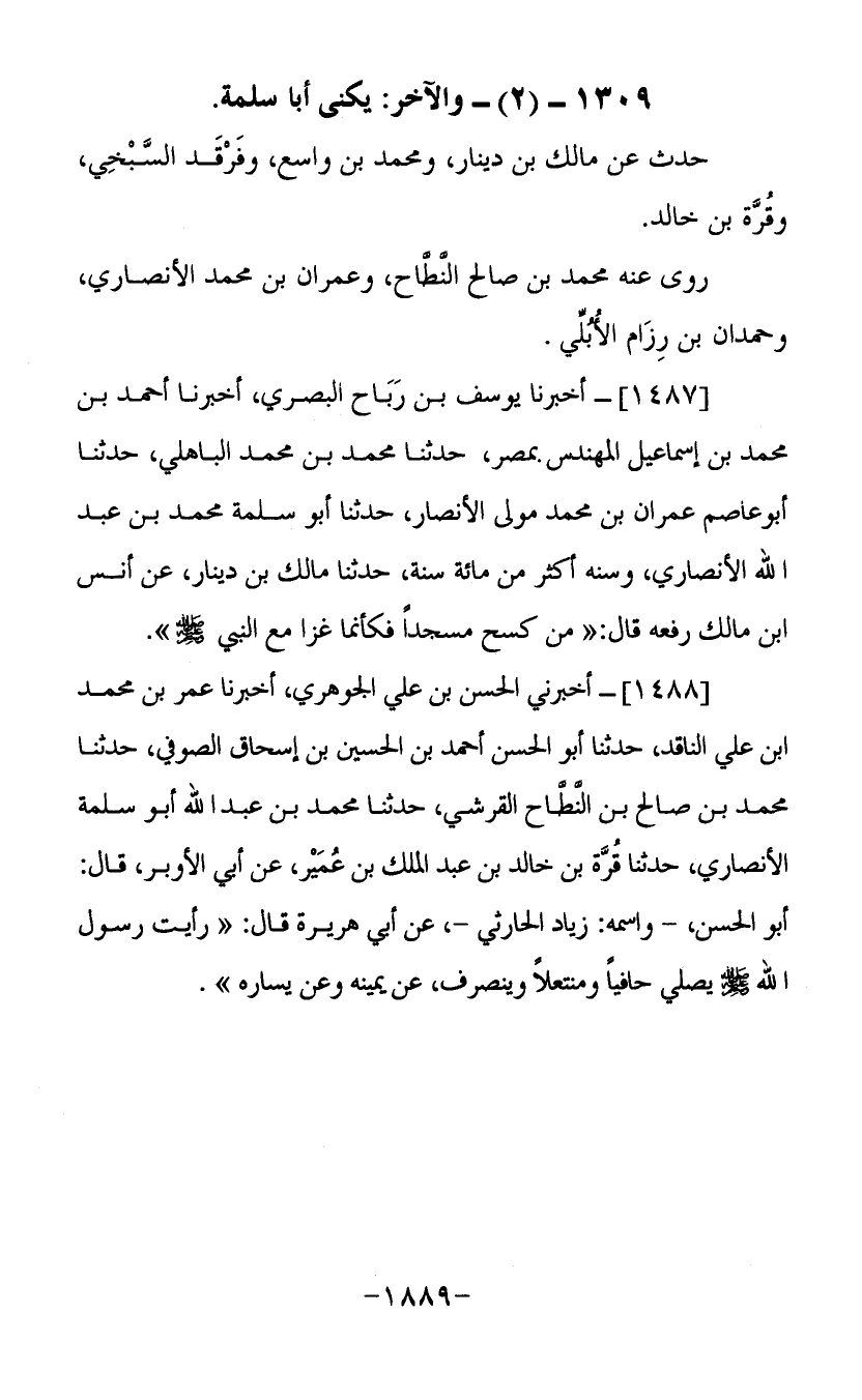 (1488) أخبرني الحسن بن علي الجوهري أخبرنا عمر بن محمد ابن علي الناقد حدثنا أبو الحسن أحمد بن الحسين بن إسحاق الصوفي حدثنا محمد بن صالح بن النطاح القرشي حدثنا محمد بن عبد الله أبو سلمة الأنصاري حدثنا قرة بن خالد بن عبد الملك بن عمير عن أبي الأوبر قال أبو الحسن واسمه زياد الحارثي عن أبي هريرة قال رأيت رسول الله صلى الله عليه وسلم يصلي حافيا ومنتعلا وينصرف عن يمينه وعن يساره.