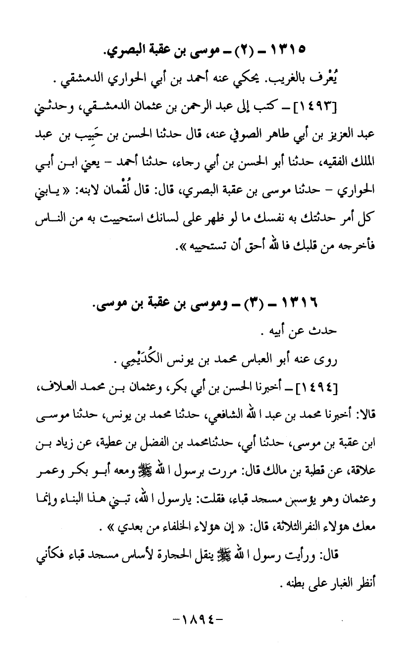 (1494) أخبرنا الحسن بن أبي بكر وعثمان بن محمد العلاف قالا أخبرنا محمد بن عبد الله الشافعي حدثنا محمد بن يونس حدثنا موسى ابن عقبة بن موسى حدثنا أبي حدثنا محمد بن الفضل بن عطية عن زياد بن علاقة عن قطبة بن مالك قال مررت برسول الله صلى الله عليه وسلم ومعه أبو بكر وعمر وعثمان وهو يؤسس مسجد قباء فقلت يا رسول الله تبني هذا البناء وإنما معك هؤلاء النفر الثلاثة قال إن هؤلاء الخلفاء من بعدي. قال: ورأيت رسول الله صلى الله عليه وسلم ينقل الحجارة لأساس مسجد قباء فكأني أنظر الغبار على بطنه.