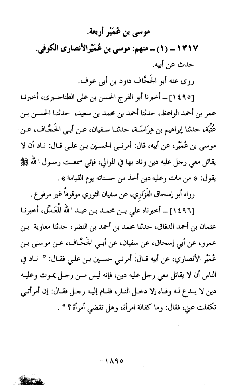 (1495) أخبرنا أبو الفرج الحسن بن علي الطناجيري أخبرنا عمر بن أحمد الواعظ حدثنا أحمد بن محمد بن سعيد حدثنا الحسن بن عتبة حدثنا إبراهيم بن هراسة حدثنا سفيان عن أبي الجحاف عن موسى بن عمير عن أبيه قال أمرني الحسين بن علي قال ناد أن لا يقاتل معي رجل عليه دين وناد بها في الموالي فإني سمعت رسول الله صلى الله عليه وسلم يقول من مات وعليه دين أخذ من حسناته يوم القيامة رواه أبو إسحاق الفزاري عن سفيان الثوري موقوفا غير مرفوع.