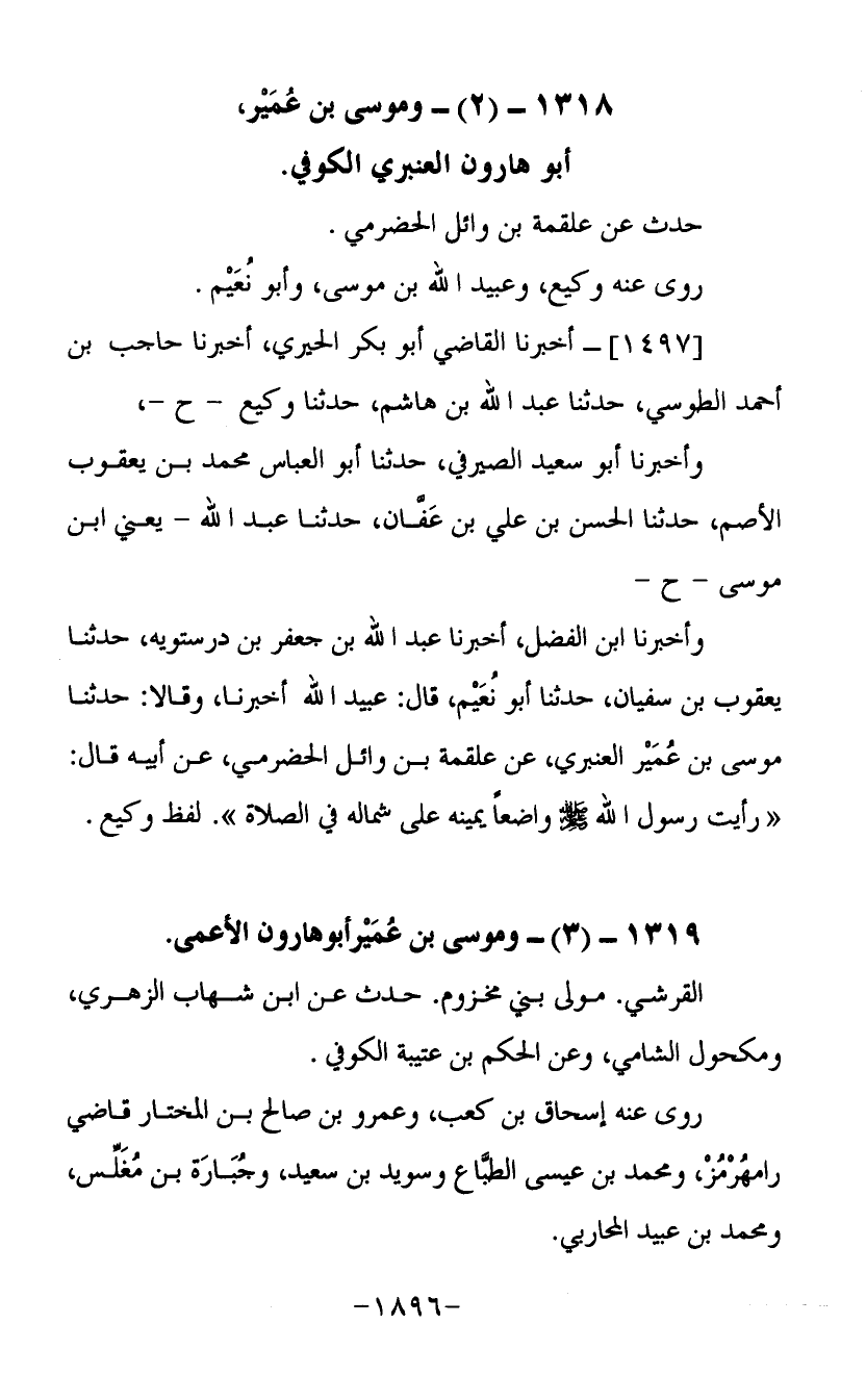 1318- (2) - موسى بن عمير أبو هارون العنبري الكوفي حدث عن علقمة بن وائل الحضري روى عنه وكيع وعبد الله بن موسى وأبو نعيم
