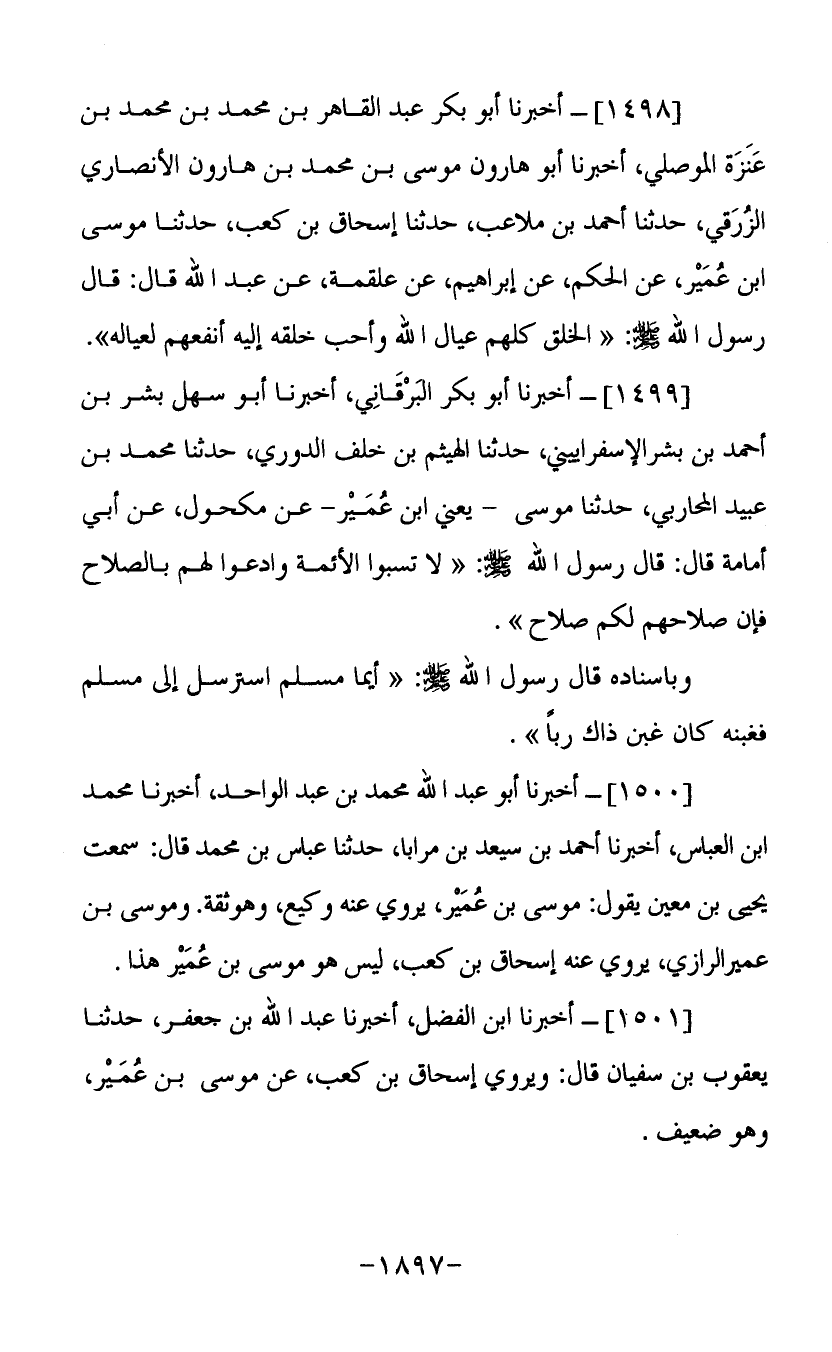 (1498) أخبرنا أبو بكر عبد القاهر بن محمد بن عنزة الموصلي أخبرنا أبو هارون موسى بن محمد بن هارون الأنصاري الزرقي حدثنا أحمد بن ملاعب حدثنا إسحاق بن كعب حدثنا موسى بن عمير عن الحكم عن إبراهيم عن علقمة عن عبد الله قال قال رسول الله صلى الله عليه وسلم الخلق كلهم عيال الله وأحب خلقه إليه أنفعهم لعياله.
