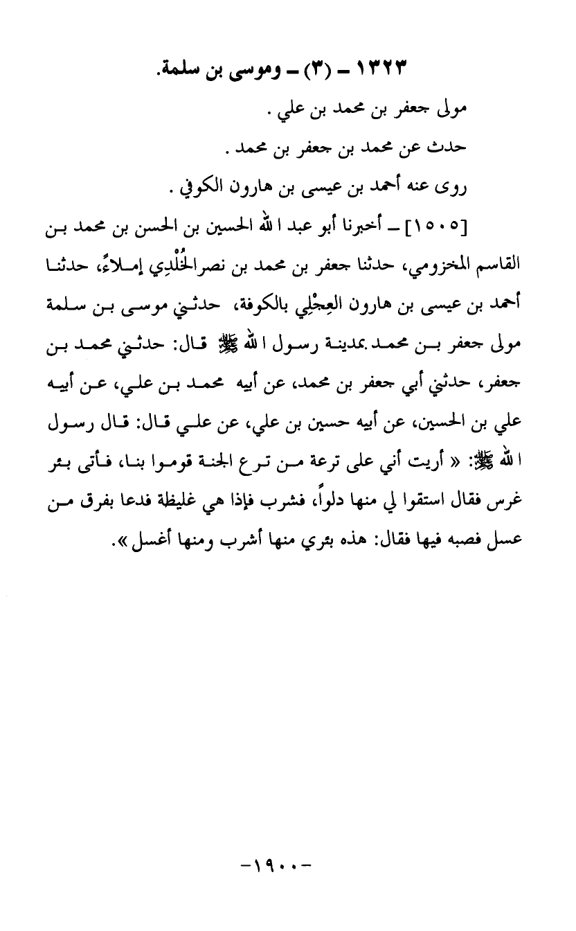 (1505) أخبرنا ابو عبد الله الحسين بن الحسن بن محمد بن القاسم المخزومي حدثنا جعفر بن محمد بن نصر الخلدي إملاء حدثنا أحمد بن عيسى بن هارون العجلي بالكوفة حدثني موسى بن سلمة مولى جعفر بن محمد بمدينة رسول الله صلى الله عليه وسلم قال حدثني محمد بن جعفر حدثني أبي جعفر بن محمد عن أبيه محمد بن علي عن أبيه علي بن الحسين عن أبيه حسين بن علي عن علي قال قال رسول الله صلى الله عليه وسلم أريت أني على ترعة من ترع الجنة قوموا بنا فأتى بئر غرس فقال استقوا لي منها دلوا فشرب فإذا هي غليظة فدعا بفرق من عسل فصبه فيها فقال هذه بئري منها أشرب ومنها أغسل.