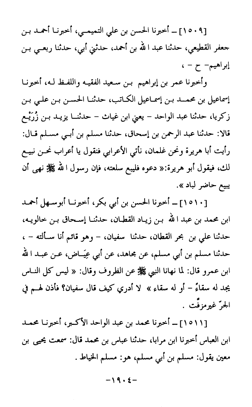 (1509) أخبرنا الحسن بن علي التميمي أخبرنا أحمد بن جعفر القطيعي حدثنا عبد الله بن أحمد حدثني أبي حدثنا ربعي بن إبراهيم ح وأخبرنا عمر بن إبراهيم بن سعيد الفقيه واللفظ له أخبرنا إسماعيل بن محمد بن إسماعيل الكاتب حدثنا الحسن بن علي بن زكريا حدثنا عبد الواحد يعني ابن غياث حدثنا يزيد بن زريع قالا حدثنا عبد الرحمن بن إسحاق حدثنا مسلم بن أبي مسلم قال رايت أبا هريرة ونحن غلمان نأتي الأعرابي فنقول يا أعراب نحن نبيع لك فيقول أبو هريرة دعوه فليبع سلعته فإن رسول الله صلى الله عليه وسلم نهى أن يبيع حاضر لباد.