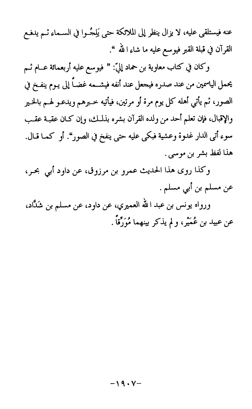 عنه فيستلقي عليه لا يزال ينظر إلى الملائكة حتى يلجوا في السماء ثم يدفع القرآن في قبلة القبر فيوسع عليه ما شاء الله وكان في كتاب معاوية بن حماد إلي فيوسع عليه أربعمائة عام ثم يحمل الياسمين من عند صدره فيجعل عند أنفه فيشمه غضا إلى يوم ينفخ في الصور ثم يأتي أهله كل يوم مرة أو مرتين فيأتيه خبرهم ويدعو لهم بالخير والإقبال فإن تعلم أحد من ولده القرآن بشره بذلك وإن كان عقبة عقب سوء أتى الدار غدوة وعشية فكبى عليه حتى ينفخ في الصور أو كما قال هذا لفظ بشر بن موسى وكذا روى هذا الحديث عمرو بن مرزوق عن داود أبي بحر عن مسلم بن أبي مسلم ورواه يونس بن عبد الله العميري عن داود عن مسلم بن شداد عن عبيد بن عمير ولم يذكر بينهما مورقا.