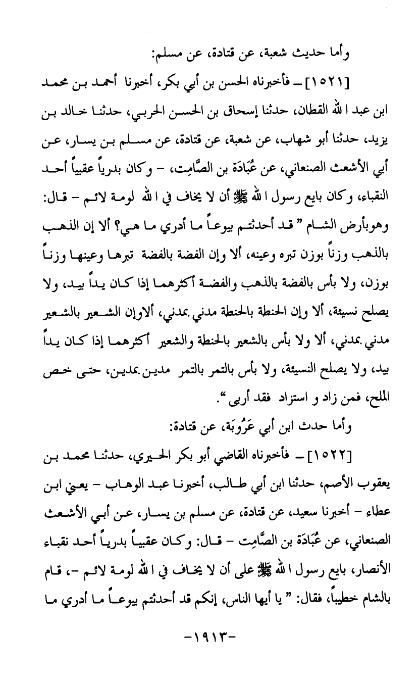 (1521) فأخبرناه الحسن بن أبي بكر أخبرنا أحمد بن محمد بن عبد الله القطان حدثنا إسحاق بن الحسن الحربي حدثنا خالد بن يزيد حدثنا أبو شهاب عن شعبة عن قتادة عن مسلم بن يسار عن أبي الأشعث الصنعاني عن عبادة بن الصامت وكان بدريا عقبيا أحد النقباء وكان بايع رسول الله صلى الله عليه وسلم أن لا يخاف في الله لومة لائم قال وهو بأرض الشام قد أحدثتم بيوعا ما أدري ما