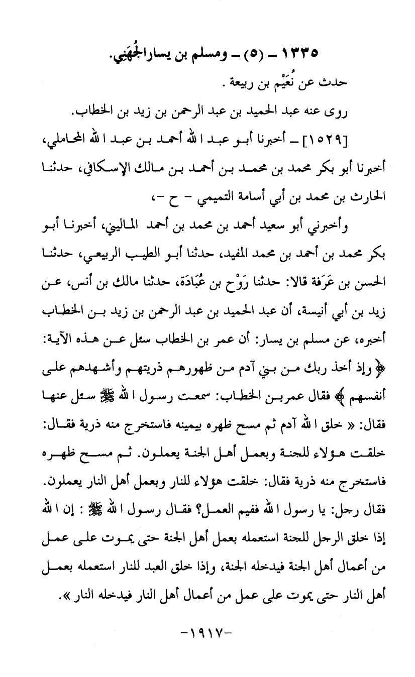 (1529) أخبرنا أبو عبد الله أحمد بن عبد الله المحاملي أخبرنا أبو بكر محمد بن محمد بن أحمد بن مالك الإسكافي حدثنا الحارث بن محمد بن أبي أسامة التميمي ح وأخبرني أبو سعيد أحمد بن محمد بن أحمد الماليني أخبرنا أبو بكر محمد بن أحمد بن محمد المفيد حدثنا أبو الطيب الربيعي حدثنا الحسن بن عرفة قالا حدثنا روح بن عبادة حدثنا مالك بن أنس عن زيد بن أبي أنيسة أن عبد الحميد بن عبد الرحمن بن زيد بن الخطاب أخبره عن مسلم بن يسار أن عمر بن الخطاب سئل عن هذه الآية {وإذ أخذ ربك من بني آدم من ظهورهم ذريتهم وأشهدهم على أنفسهم} فقال عمر بن الخطاب سمعت رسول الله صلى الله عليه وسلم سئل عنها فقال خلق الله آدم ثم مسح ظهره بيمينه فاستخرج منه ذرة فقال خلقت هؤلاء للجنة وبعمل أهل الجنة يعملون ثم مسح ظهره فاستخرج مه ذرية فقال خلقت هؤلاء للنار وبعمل أهل النار يعملون فقال رجل يا رسول الله ففيم العمل فقال رسول الله صلى الله عليه وسلم إن الله إذا خلق الرجل للجنة استعمله بعمل أهل الجنة حتى يموت على عمل من أعمال أهل الجنة فيدخله الجنة وإذا خلق العبد للنار استعمله بعمل أهل النار حتى يموت على عمل من أعمال أهل النار فيدخله النار.