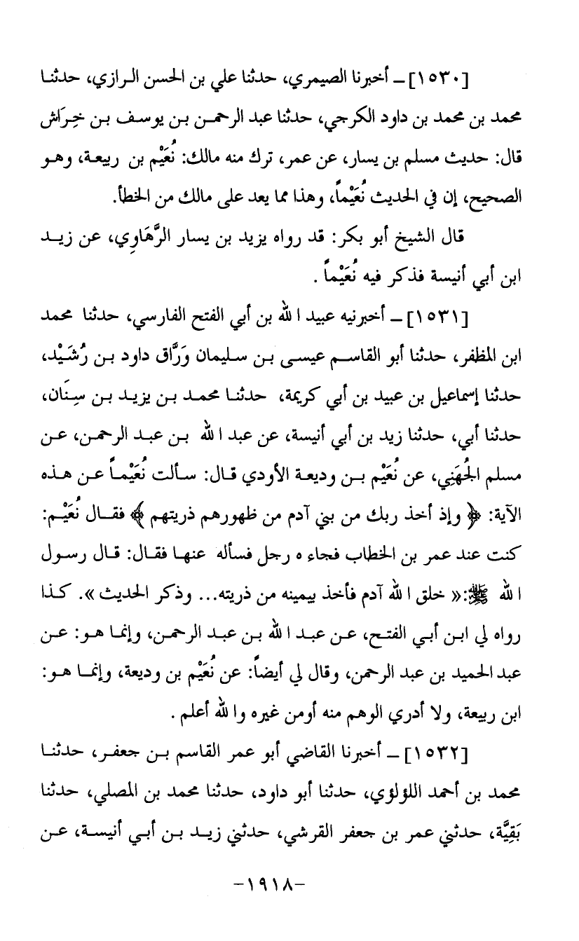 (1531) أخبرنيه عبيد الله بن أبي الفتح الفارسي حدثنا محمد ابن المظفر حدثنا أبو القاسم عيسى بن سليمان وراق داود بن رشيد حدثنا أبو القاسم عيسى بن سليمان وراق داود بن رشيد حدثنا إسماعيل بن عبيد بن أبي كريمة حدثنا محمد بن يزيد بن سنان حدثنا أبي حدثنا زيد بن أبي أنيسة عن عبد الله بن عبد الرحمن عن مسلم الجهني عن نعيم بن وديعةا لأودي قال سألت نعيما عن هذه الآية {وإذ أخذ ربك من بني آدم من ظهورهم ذريتهم} فقال نعيم كنت عند عمر بن الخطاب فجاءه رجل فسأله عنها فقال قال رسول الله صلى الله عليه وسلم خلق الله آدم فأخذ بيمينه من ذريته وذكر الحديث كذا رواه لي ابن أبي الفتح عن عبد الله بن عبد الرحمن وإنما هو عن عبد الحميد بن عبد الرحمن وقال لي أيضا عن نعيم بن وديعة وإنما هو ابن ربيعة ولا أدري الوهم منه أو من غيره والله أعلم.