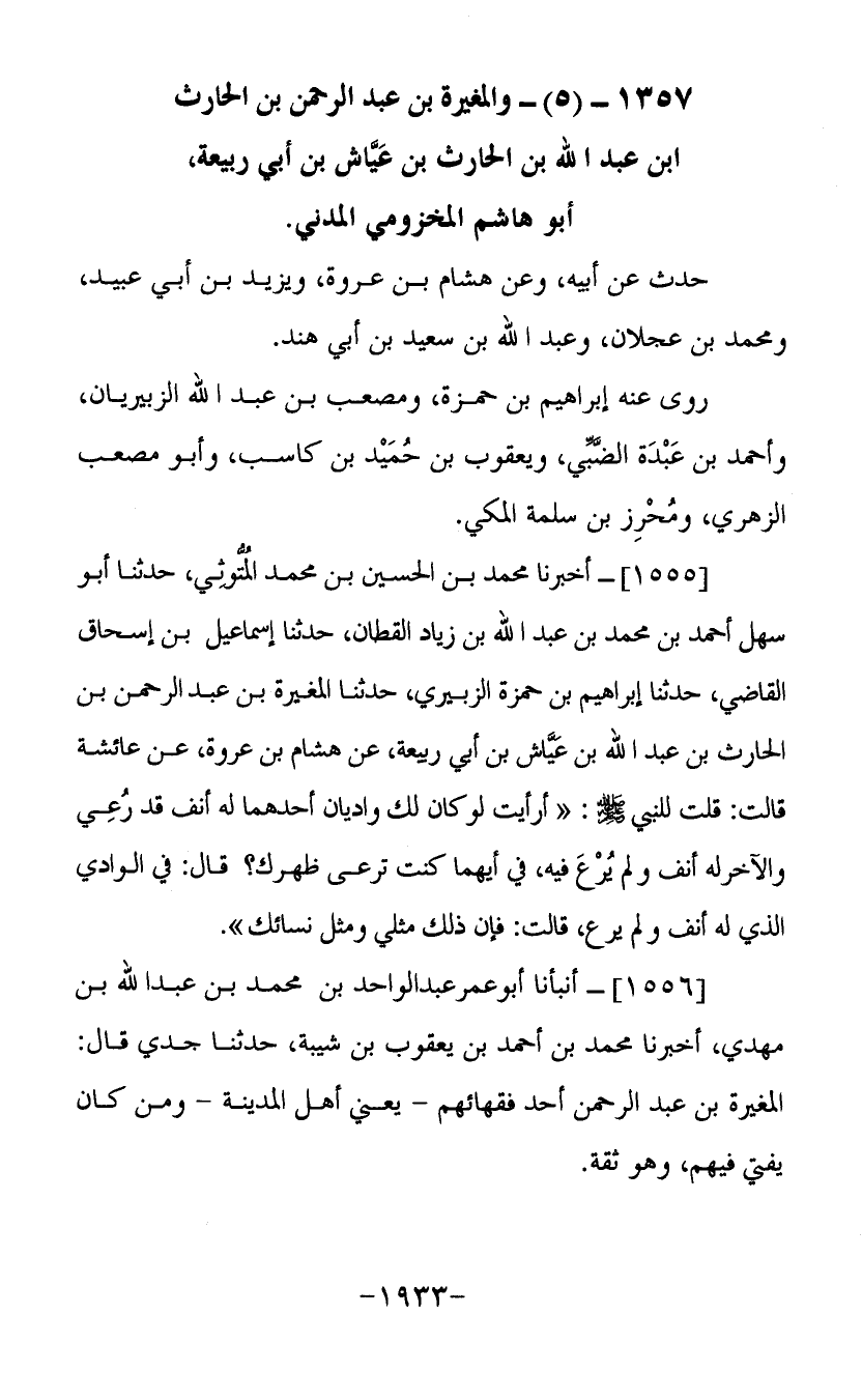 1357- (5) والمغيرة بن عبد الرحمن بن الحارث بن عبد الله بن الحارث بن عياش بن أبي ربيعة أبو هاشم المخزومي المدني