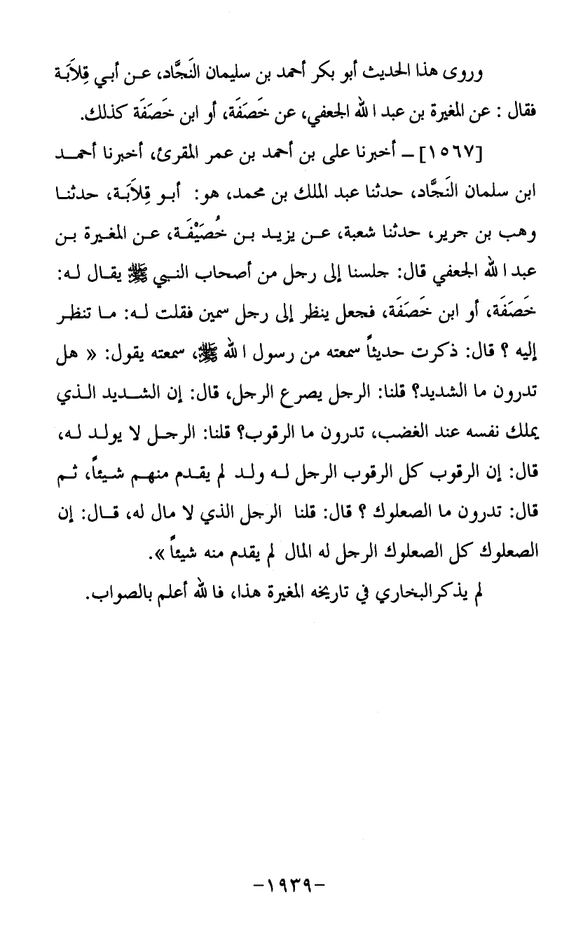 (1567) أخبرنا علي بن أحمد بن عمر المقرئ أخبرنا أحمد بن سلمان النجاد حدثنا عبد الملك بن محمد هو أبو قلابة حدثنا وهب بن جرير حدثنا شعبة عن يزيد بن خصيفة عن المغيرة بن عبد الله الجعفي قال جلسنا إلى رجل من أصحاب النبي صلى الله عليه وسلم يقال له خصفة أو ابن خصفة فجعل ينظر إلى رجل سمين فقلت له ما تنظر إليه قال ذكرت حديثا سمعته من رسول الله صلى الله عليه وسلم سمعته يقول هل تدرون ما الشديد قلنا الرجل يصرع الرجل قال إن الشديد الذي يملك نفسه عند الغضب تدرون ما الرقوب قلنا الرجل لا يولد له قال إن الرقوب كل الرقوب الرجل له ولد لم يقدم منهم شيئا ثم قال تدرون ما الصعلوك قال قلنا الرجل الذي لا مال له قال إن الصعلوك كل الصعلوك الرجل له المال لم يقدم منه شيئا لم يذكر البخاري في تاريخه المغيرة هذا فالله أعلم بالصواب.