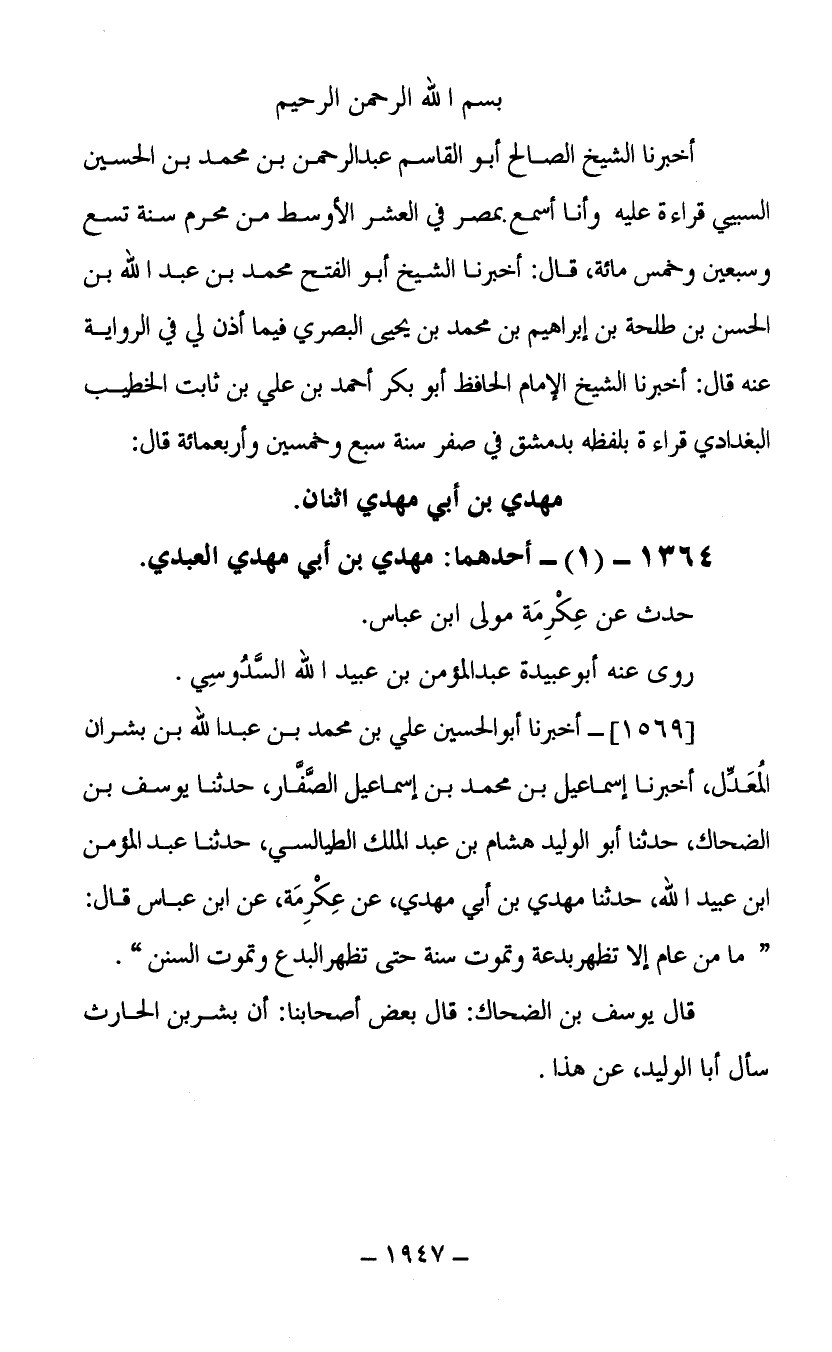 (1569) أخبرنا أبو الحسين علي بن محمد بن عبد الله بن بشران المعدل أخبرنا إسماعيل بن محمد بن إسماعيل الصفار حدثنا يوسف بن الضحاك حدثنا أبو الوليد هشام بن عبد الملك الطيالسي حدثنا عبد المؤمن ابن عبيد الله حدثنا مهدي بن أبي مهدي عن عكرمة عن ابن عباس قال ما من عام إلا تظهر بدعة وتموت سنة حتى تظهر البدع وتموت السنن قال يوسف بن الضحاك قال بعض أصحابنا أن بشر بن الحارث سأل أبا الوليد عن هذا.