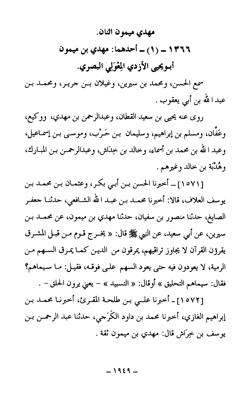 (1572) أخبرنا علي بن طلحة المقرئ أخبرنا محمد بن إبراهيم الغازي أخبرنا محمد بن داود الكرجي حدثنا عبد الرحمن بن يوسف بن خراش قال مهدي بن ميمون ثقة.