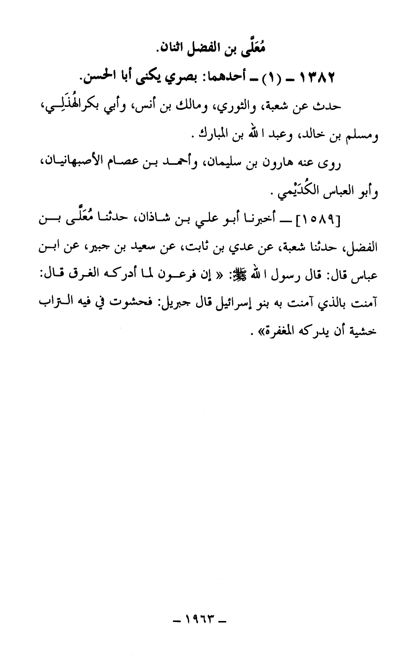 (1589) أخبرنا أبو علي بن شاذان حدثنا معلى بن الفضل حدثنا شعبة عن عدي بن ثابت عن سعيد بن جبير عن ابن عباس قال قال رسول الله صلى الله عليه وسلم إن فرعون لما أدركه الغرق قال آمنت بالذي آمنت به بنو إسرائيل قال جبريل فحشوت في فيه التراب خشية أن يدركه المغفرة.